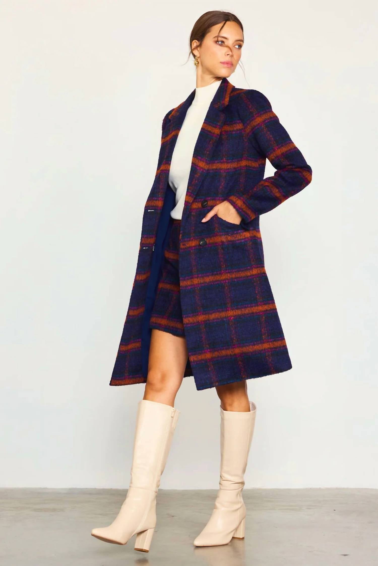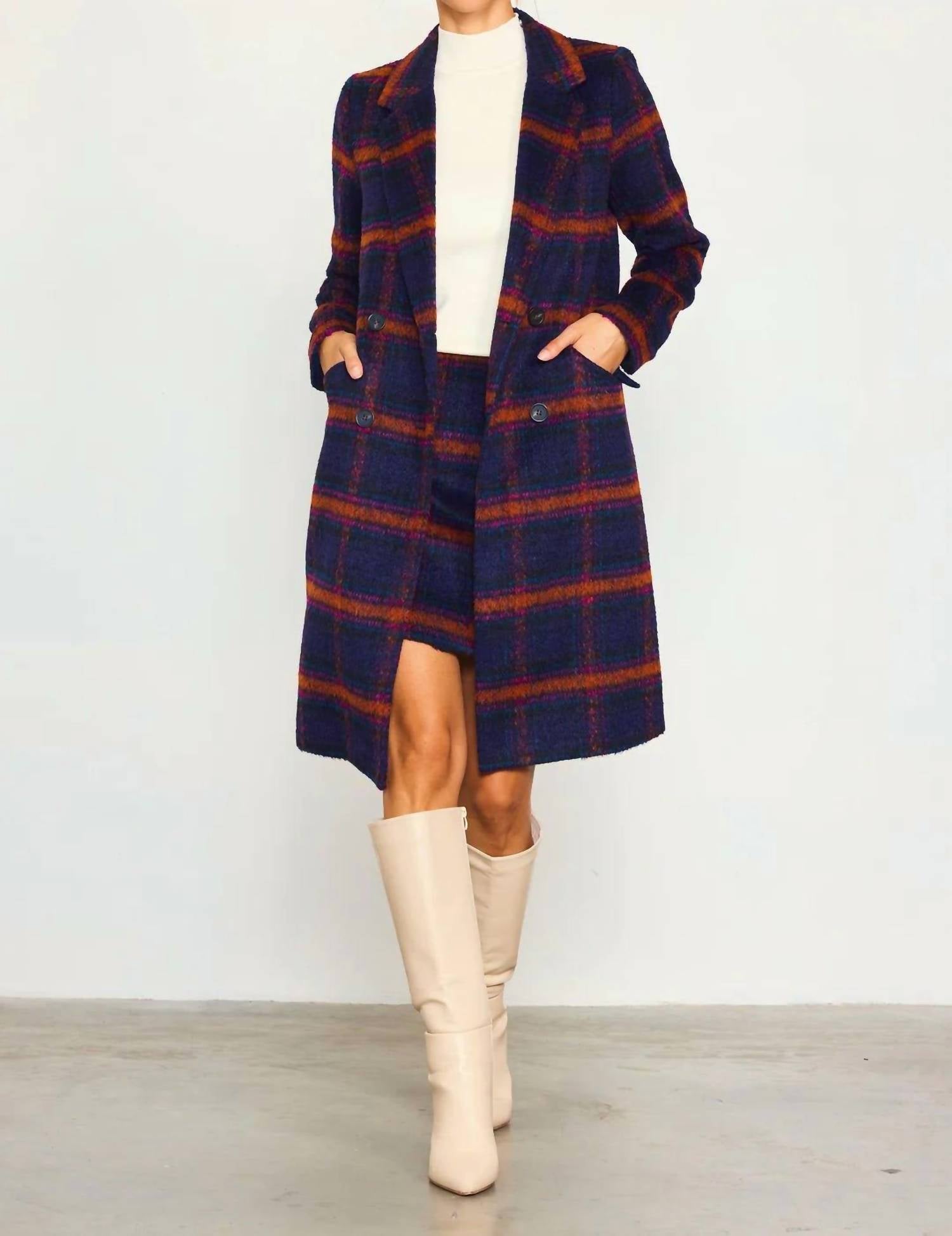 Everyone needs a classic pea coat in their closet and this version might just be our favorite. Step out in timeless style with the Double Breasted Plaid Coat by SKIES ARE BLUE, perfect for fall travels and New Year's Eve festivities. This navy-teal masterpiece is crafted with long sleeves and a cozy plaid motif that spells classic sophistication. Boasting a button closure, this coat features flap pockets and notched lapels, adding to its vintage allure. Made from 100% polyester with a luxurious lining of 96% polyester and 4% spandex, it ensures a snug fit while requiring only a gentle hand wash and line dry.