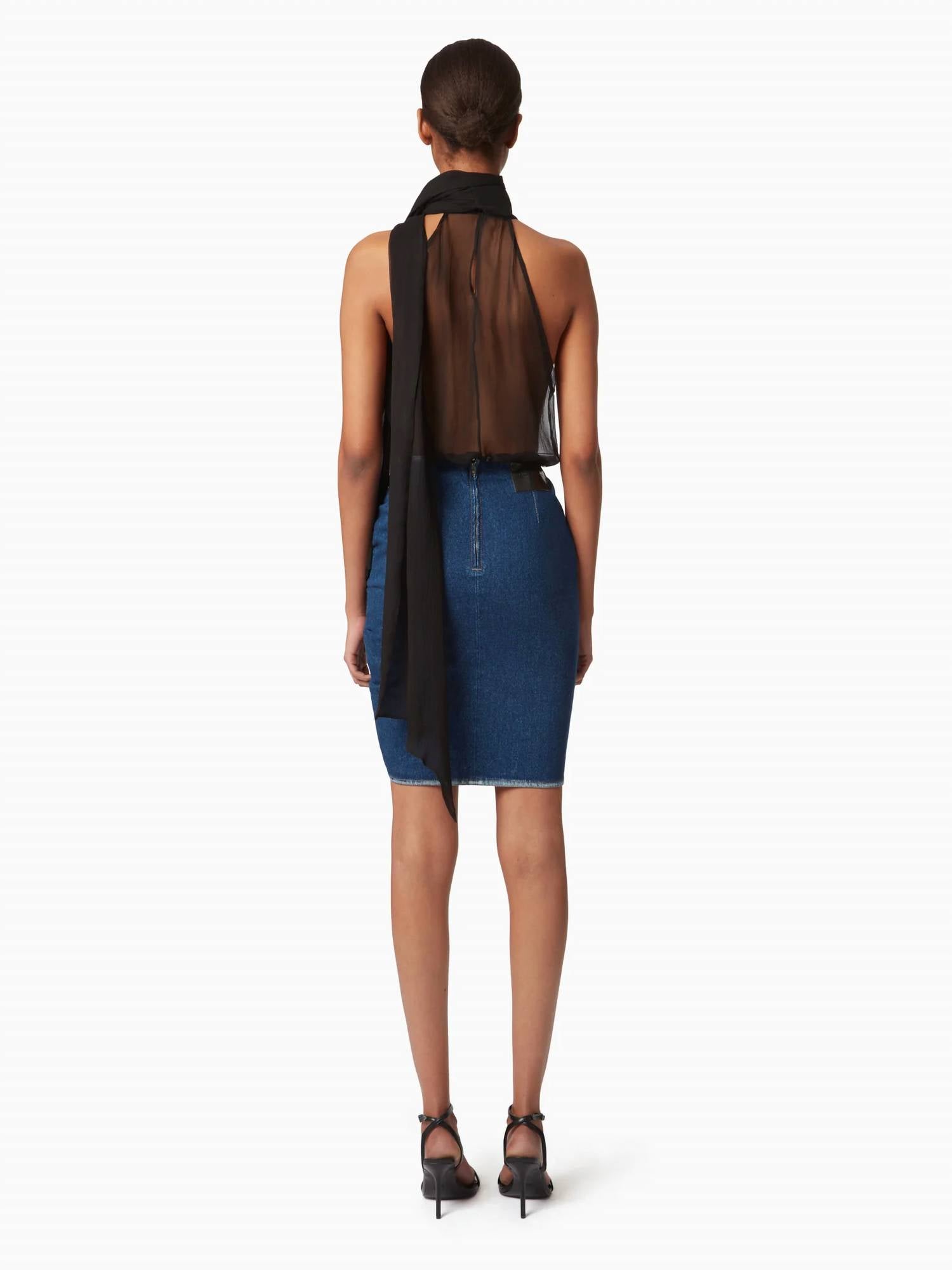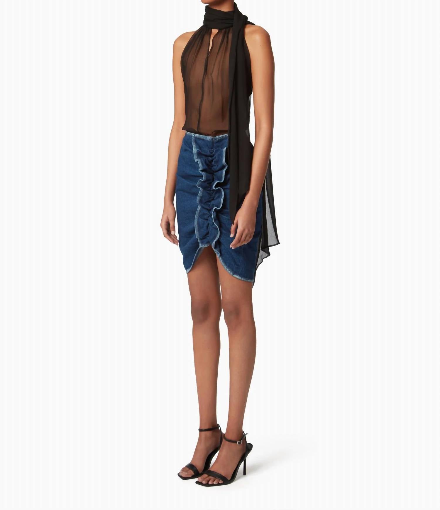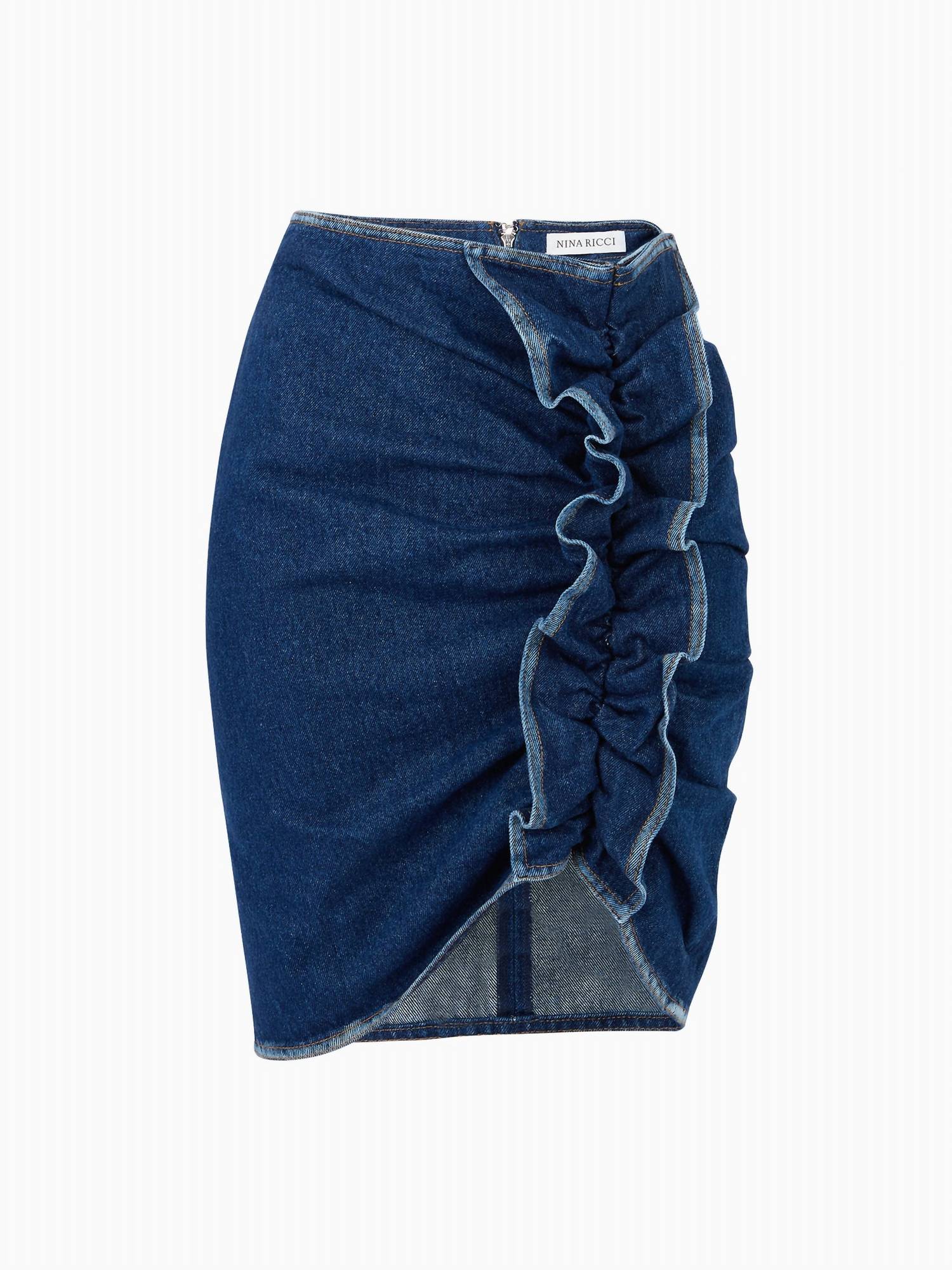 Fit flattering, sexy and comfortable. This pencil skirt has it all. Introducing the Draped Denim Midi Skirt by Nina Ricci in a timeless BLEU FONCE hue, perfect for making a statement at any evening event. This women's pencil skirt stands out with its gathered ruffles and couture cut-outs, featuring a mini length with a high waist and solid pattern. Made from 100% organic cotton denim, it boasts a back zipper closure and intricate faded topstitching for a vintage flair. Please refer to care instructions for proper maintenance.