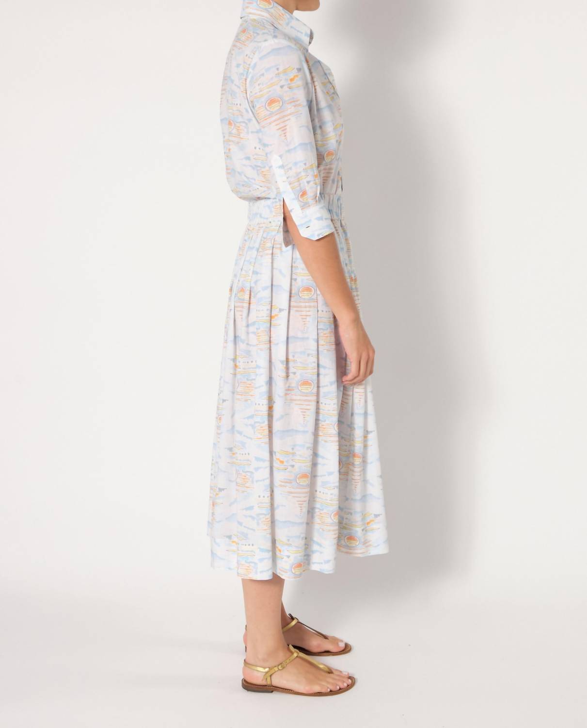This pencil skirt is suprisingly comfortable and hugs in all the right places. Introducing the Venise Skirt by LA PRESTIC OUISTON, a stylish midi flared silhouette crafted from 100% silk twill. Made in Europe, this skirt boasts exclusive prints in a captivating L.A. Sunset Ciel color and features pleats with an elastic waistband for comfort. It offers a pull-on closure, ensuring ease of wear without compromising elegance. For best results, dry clean only.