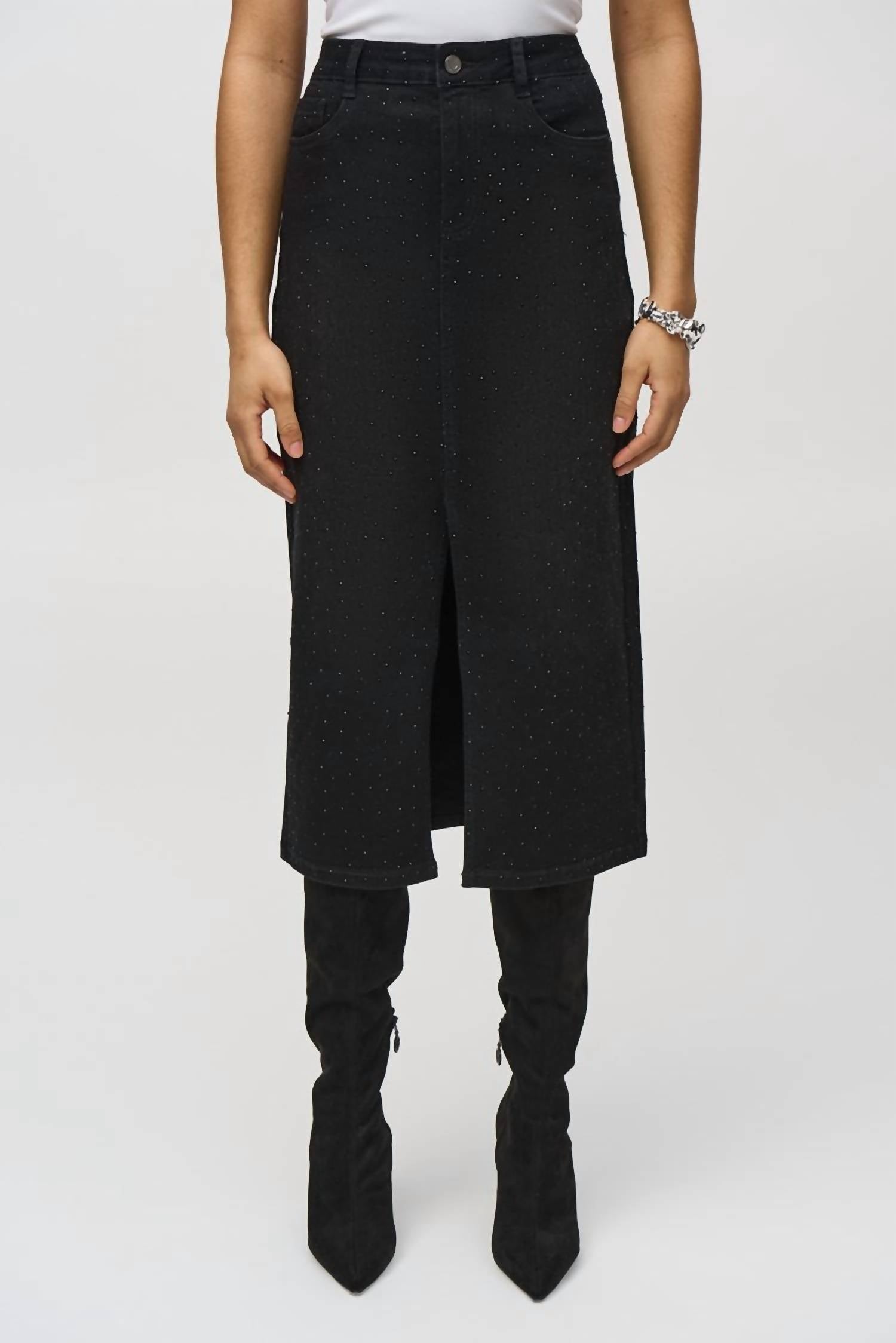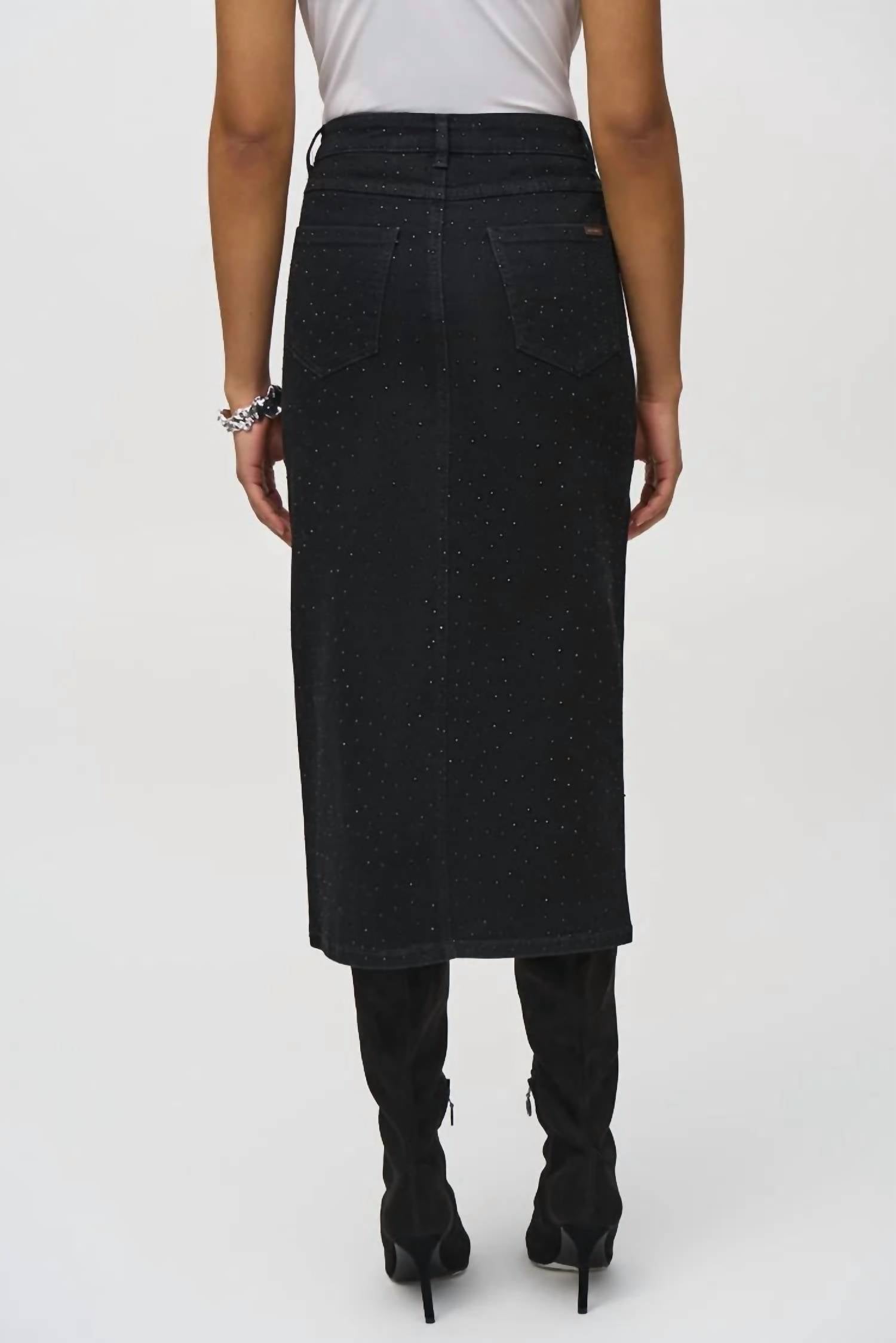 This pencil skirt is suprisingly comfortable and hugs in all the right places. Introducing the Classic Denim Pencil Skirt with Rhinestones by Joseph Ribkoff, a chic addition in a textured black cotton blend. This women's skirt showcases a stylish front slit, accented by 5-pocket detailing and all-over rhinestone embellishments. Composition: 72% Cotton, 23% Recycled Polyester, 3% Viscose Rayon, 2% Spandex. Closure: Button closure. Care: Hand wash in cold water with like colors, line dry in shade only, low iron if necessary.