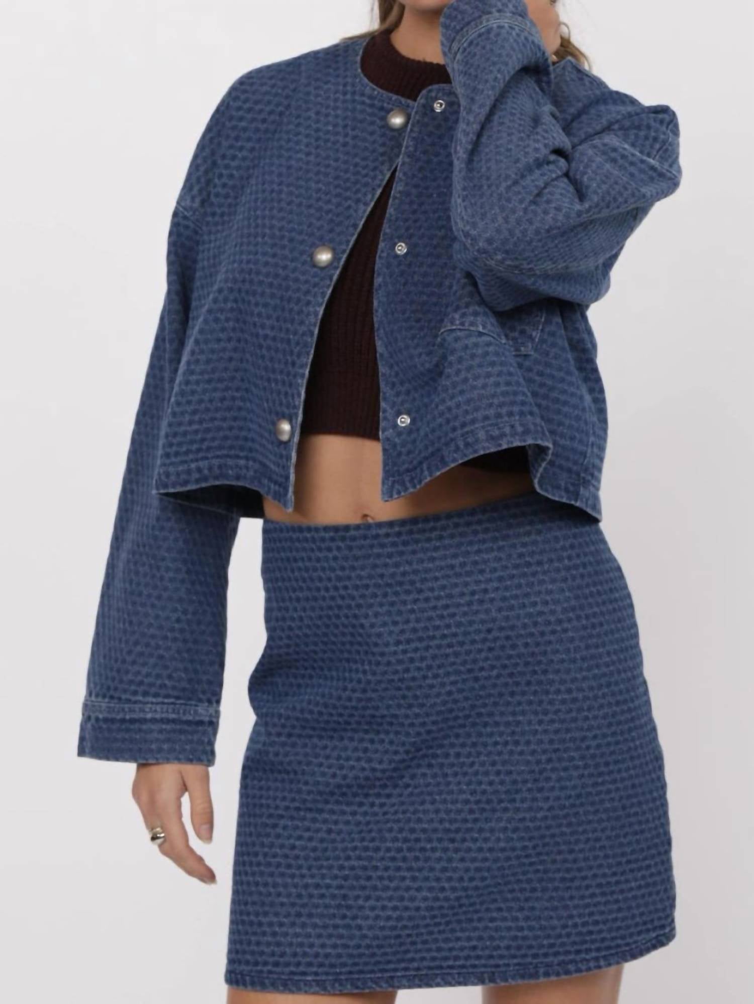 This pencil skirt is suprisingly comfortable and hugs in all the right places. Embrace the quiet luxury of the Chances Denim Mini Skirt by SAGE THE LABEL, a perfect choice for a chic dinner party. Crafted from denim, this pencil skirt in blue offers a stylish patterned design that stands out. With a zip closure for easy wear, this piece showcases versatility and comfort inherent to the spring season. For care, simply machine wash and tumble dry.