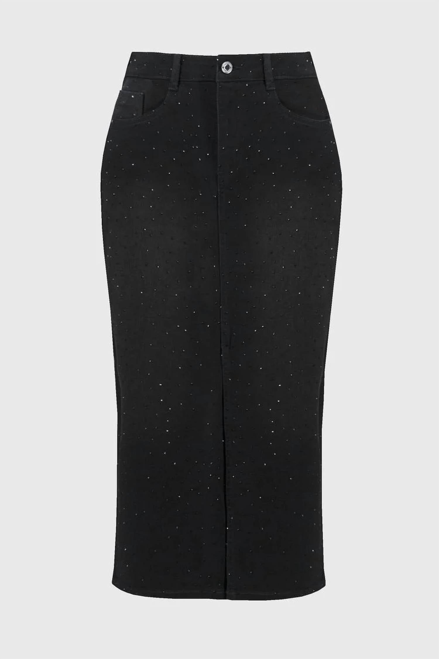 Dress this pencil skirt up with a blazer or down with your favorite tee. So versatile and timeless. Chic addition to any wardrobe, capturing the essence of 90s fashion with a modern twist. Made of 72% Cotton, 23% Recycled Polyester, 3% Viscose Rayon, and 2% Spandex. Offers a comfortable fit in a trendy denim fabric. Featuring a button closure and all-over rhinestone details. Boasts a sophisticated pencil silhouette with a front slit and 33-inch outseam. Perfect for a holiday party, includes a practical 5-pocket style and is designed for women with a passion for sustainable fashion choices.