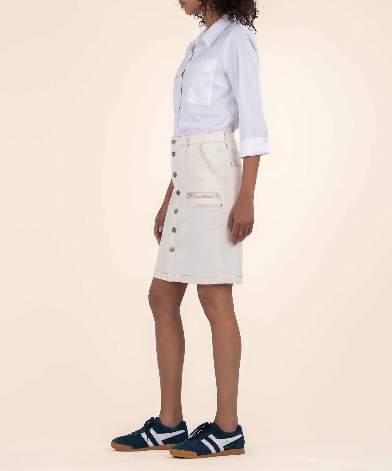 Fit flattering, sexy and comfortable. This pencil skirt has it all. The Isla Pencil Skirt by KUT FROM THE KLOTH is a sophisticated addition to your wardrobe, featuring a cream hue with contrast brown stitching for a refined look. This skirt is crafted from a comfortable cotton blend made of 91% cotton, 7% polyester, and 2% spandex, ensuring a perfect fit. It measures approximately 21 1/2" at the center front. Designed with convenient porkchop pockets and a button closure, this piece combines style with practicality.