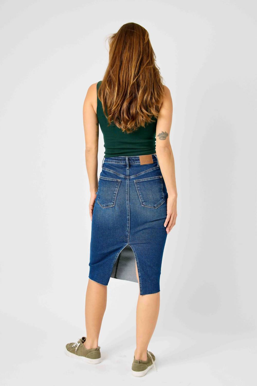 Fit flattering, sexy and comfortable. This pencil skirt has it all. Elevate your wardrobe with the Downtown Stroll Skirt by Judy Blue, a pencil skirt in a versatile Medium Wash that's designed to flatter. Crafted from a comfortable Cotton Blend, it features a high waist and a flirty back slit enhancing its mid-length silhouette. With the practicality of pockets and a button closure, this skirt seamlessly combines style and functionality. Perfect for showcasing your curves, it’s an essential piece for any occasion.