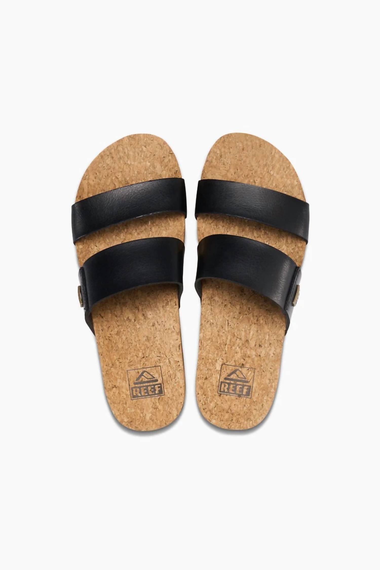 Add a little height with the perfect platform. Step up your summer style with Reef's Cushion Vista Higher Sandals, designed to elevate your look with a 2.5-inch platform heel. These platform-style sandals come in classic black with a super-soft, unlined PVC-free vegan leather two-strap design. The footbed is crafted for ultimate comfort with cushion and rebound support, generous arch support, and heel cupping. Featuring a lightweight, durable EVA outsole with an exaggerated notch detail, these sandals are a streetwear essential for travel and everyday wear. Sustainability is also prioritized with a 100% natural footbed cover, making these a guilt-free fashion pick.
