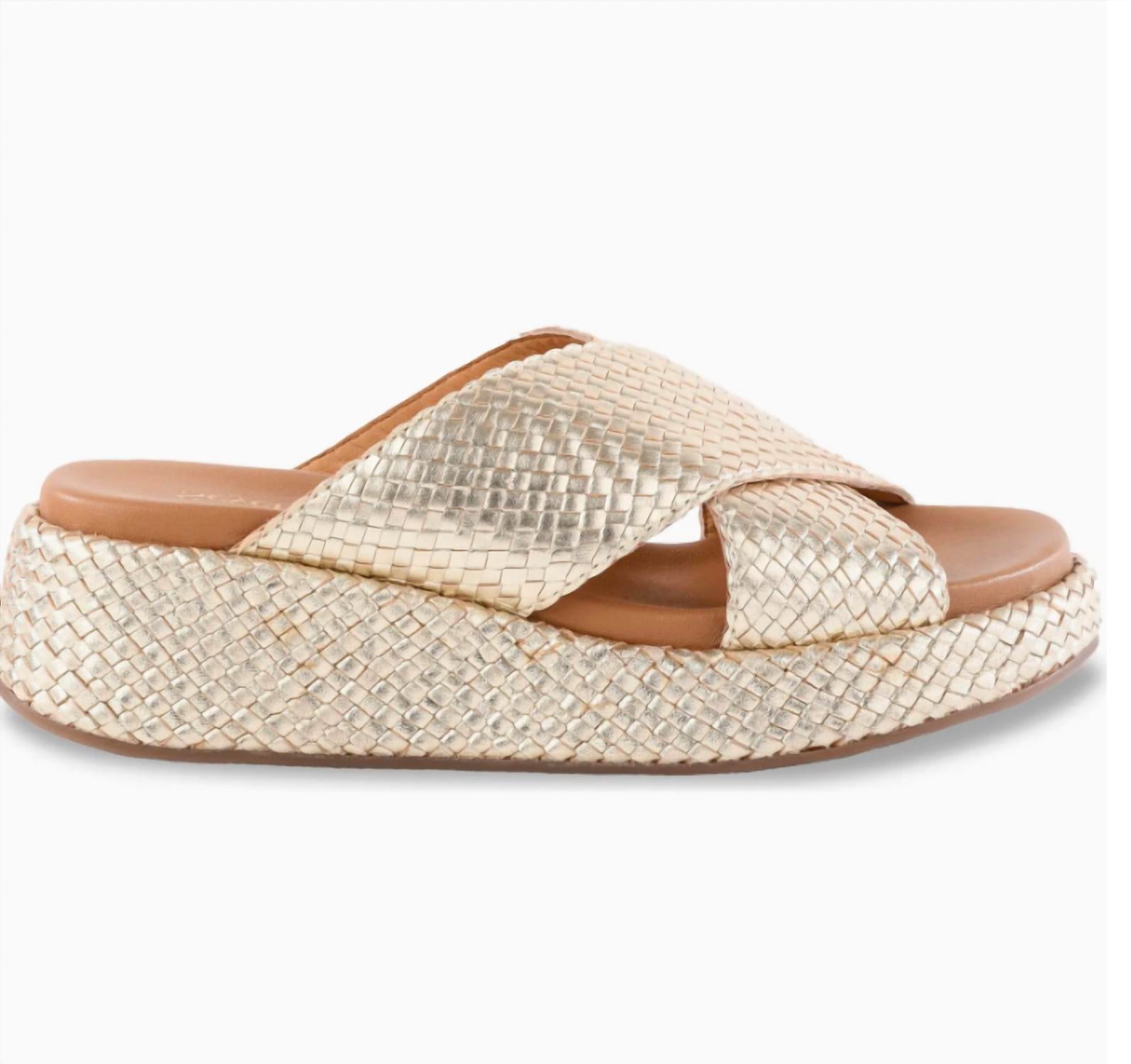 A trend that everyone is loving and this style might just be our favorite. These slip-on cross band sandals have a woven leather upper and wrapped platform with a 2.5-inch heel height and 1.5-inch platform height. They feature a rubber outsole, comfort technology, and a metallic pattern.