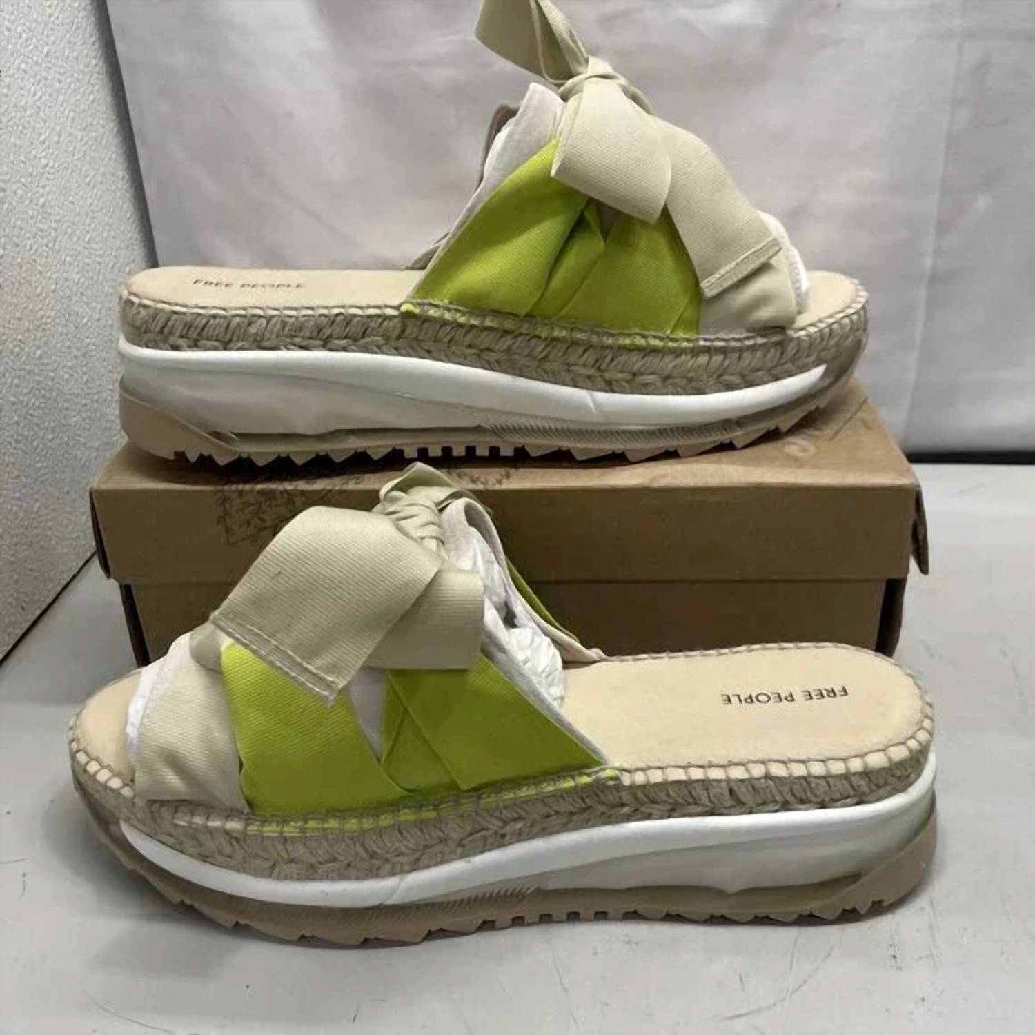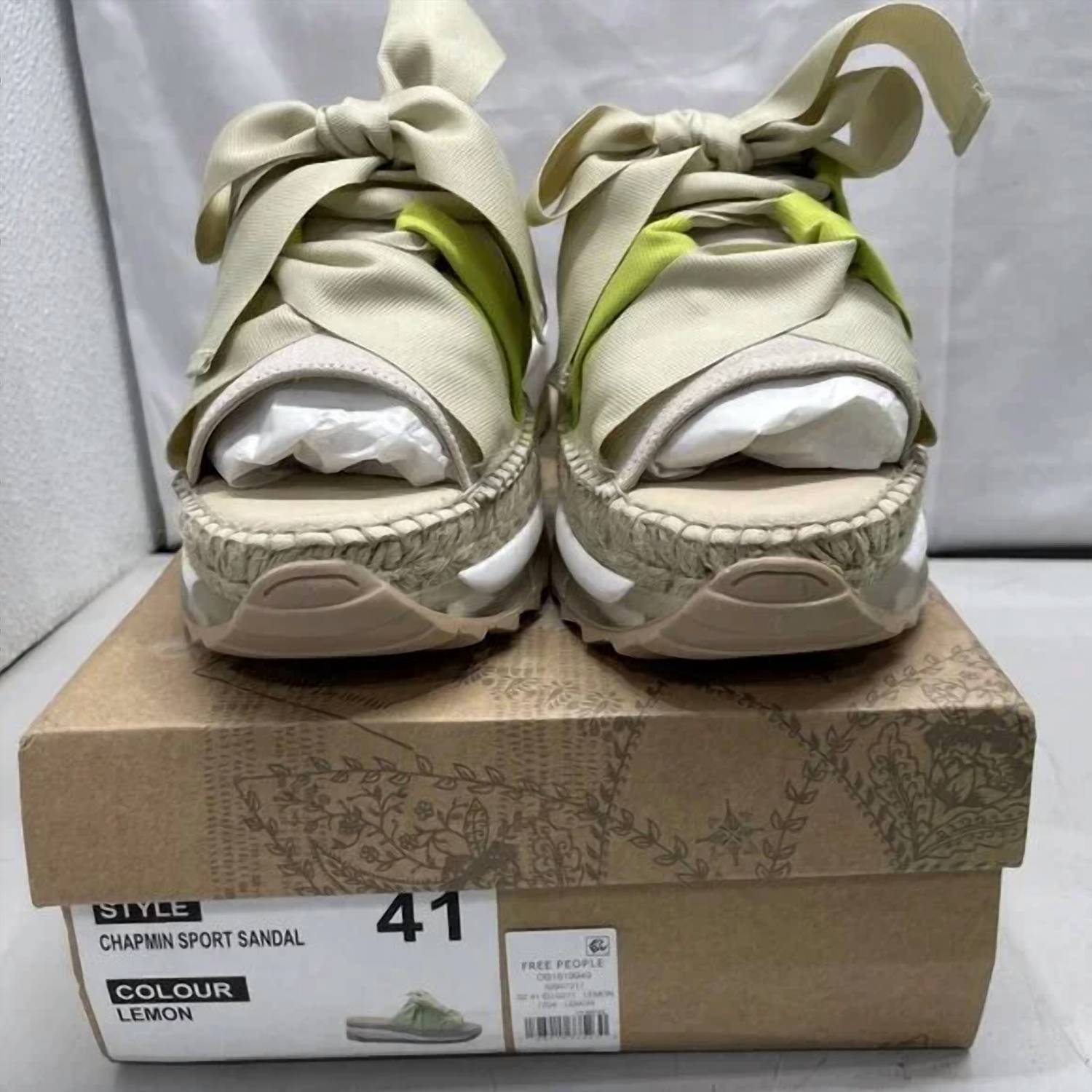 Add a little height with the perfect platform. Step out in style this summer with the Women's Chapmin Sport Sandals by Free People, a perfect blend of flirty and sporty. These espadrille-inspired wedges feature a 1 1/2" heel with a treaded platform and an open toe design, ideal for a beach day look. Crafted with a leather and textile upper, leather lining, and synthetic sole, these sandals are made in Spain for quality you can trust. Enjoy the boho chic trend with a classic lace-up style in vibrant lemon, ensuring you stand out on every sunny day.