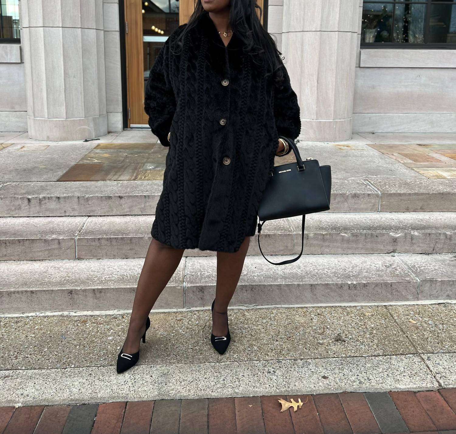 You'll be reaching for this puffer jacket all season long. Introducing the Embossed Single Breasted Fur Coat by DAVI & DANI, a chic addition to your wardrobe in classic black. This coat features long sleeves and an embossed knit design, crafted from 100% polyester for warmth and style. Closure: Button closure. Care: Dry clean only. Tailored with elegance in mind, it's perfect for a dinner party or a springtime outing.