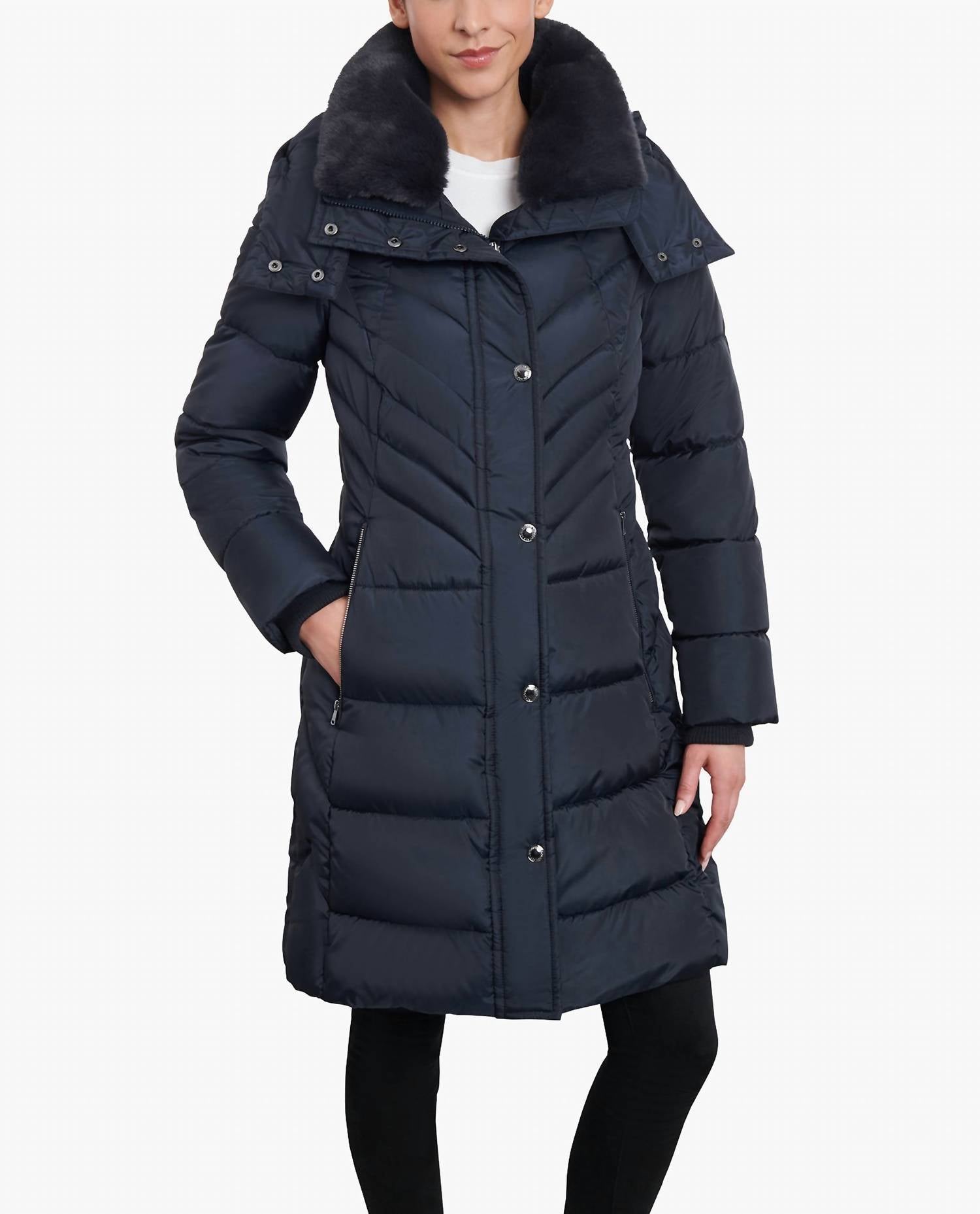 You'll be reaching for this puffer jacket all season long. Introducing the Plus Size Hooded Puffer Jacket with Button-off Fur Collar by London Fog, a winter staple that combines style and functionality in a rich navy hue. This long-sleeved jacket features a water-resistant, quilted-down design with a zip closure and snap buttons, enhanced by a removable faux fur collar and zip-off hood. Crafted from 100% polyester, it includes handy front zip pockets and knit cuffs for added warmth. For care, detach the hood before machine washing on a gentle cycle and tumble dry low; maintain the hood separately without tumble drying to preserve its shape.