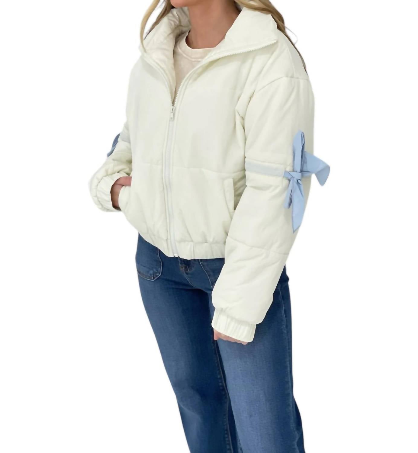 Discover warmth and style. Perfect for tailgate season and beyond. Crafted from 100% Nylon with a 100% Polyester lining. Offering a cozy yet lightweight feel. Featuring a versatile white hue. Includes a front zip closure, charming gathered trim, and dainty ribbon bow accents for a feminine touch. Designed with a turtleneck and dual pockets. Premium puffer jacket brings a blend of functionality and elegance to your winter wardrobe.