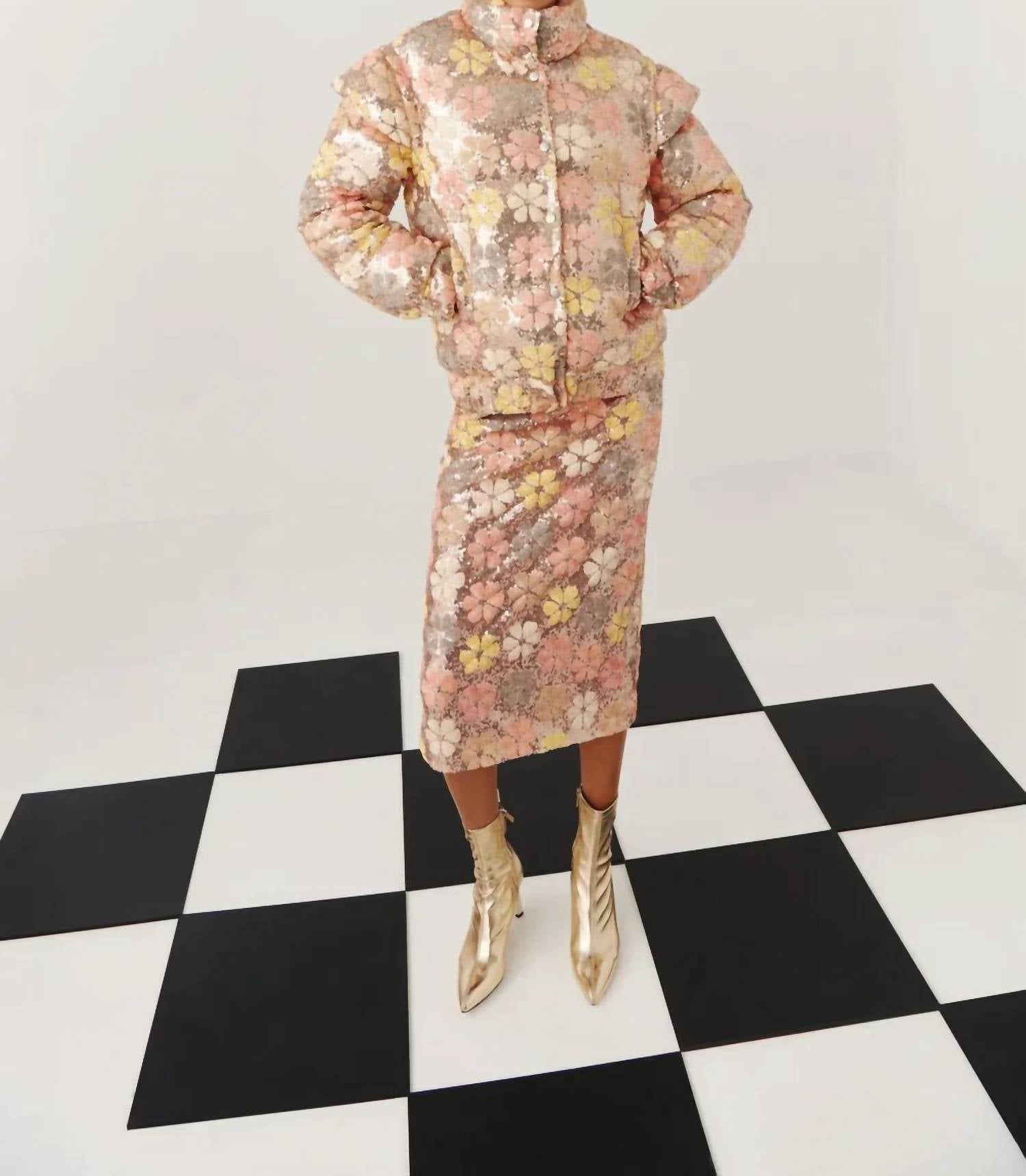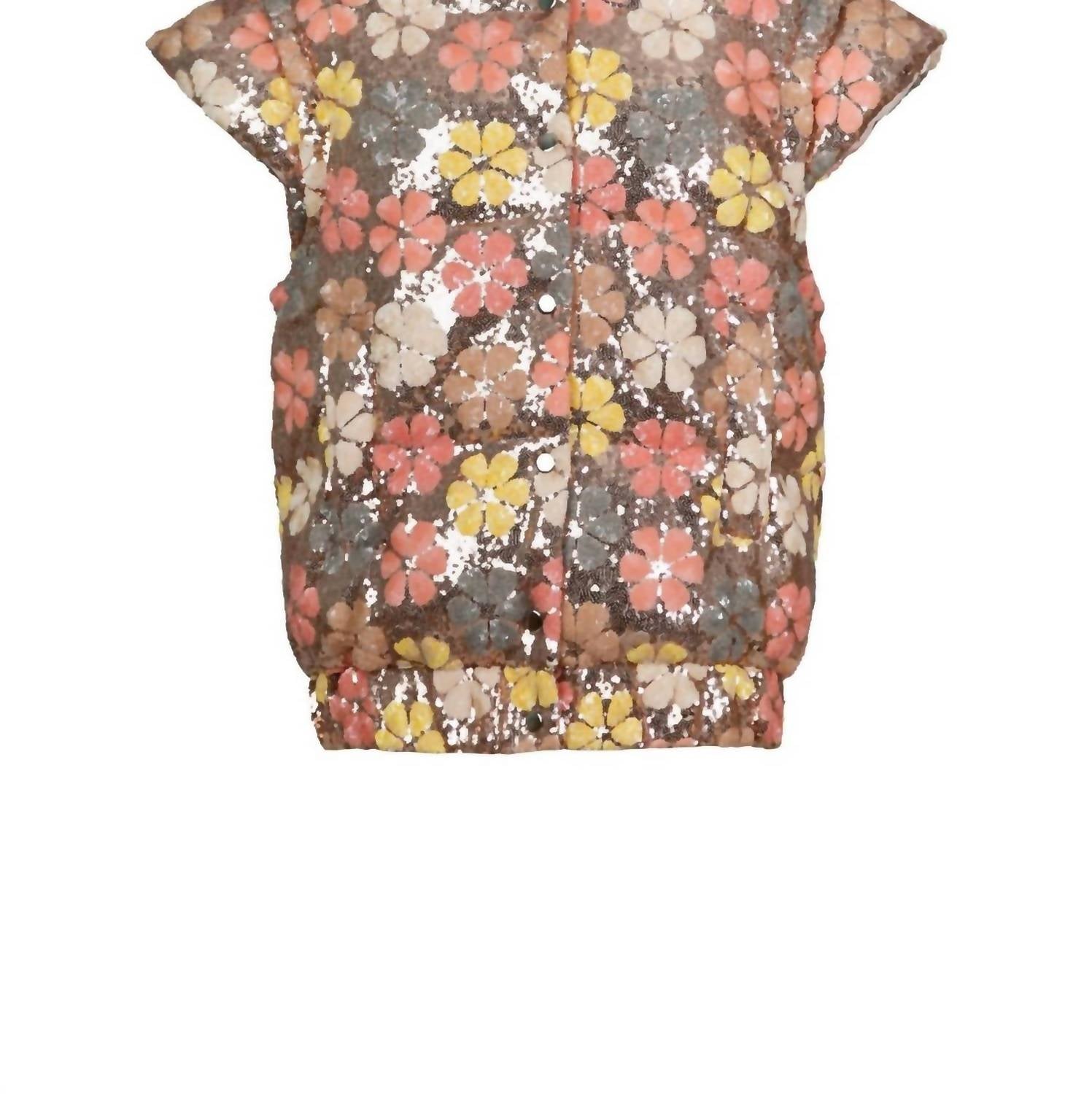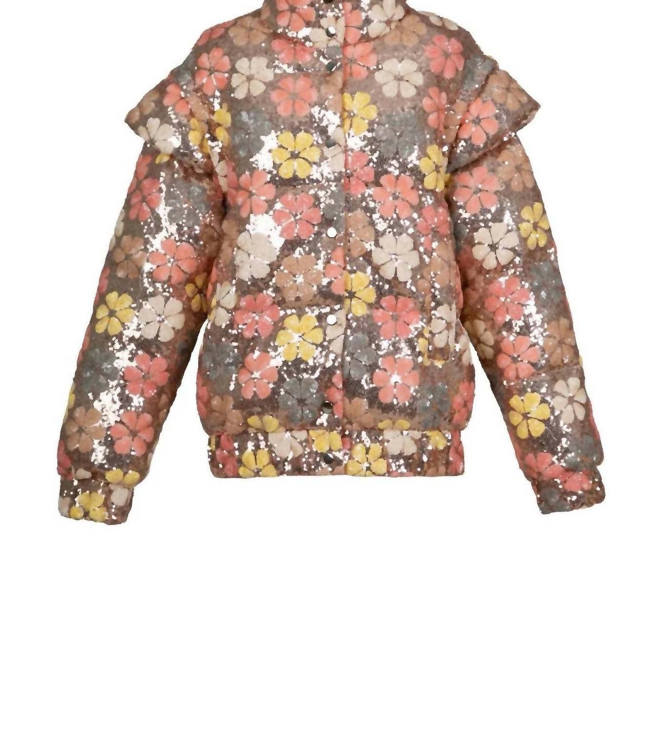 You'll be reaching for this puffer jacket all season long. Stylish outerwear option adorned with a charming floral pattern in soft pastel hues over a metallic champagne background. Long-sleeve jacket is crafted entirely from polyester. Offering lightweight warmth and versatility with zip-off sleeves to easily transform it into a vest. High collar lends additional protection against the cold, while a snap closure ensures secure wear. To maintain its vibrant appeal, dry clean only and avoid bleaching.