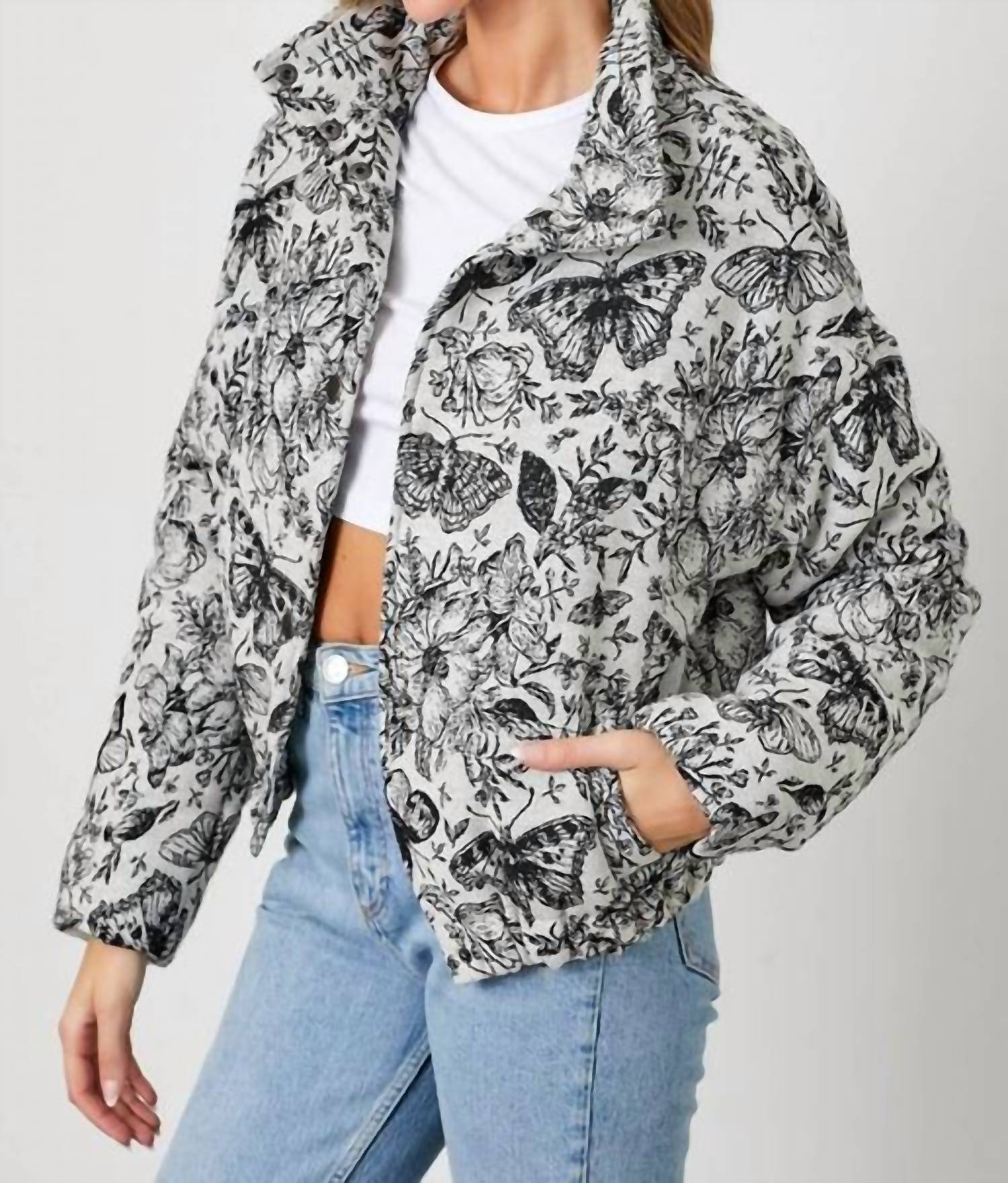 Cozy, cute and timeless. The puffer jacket that will keep you warm all season long. Floral jacquard puff jacket with butterfly accents. Functional buttons and pockets for practicality. Crafted from 100% polyester for warmth and durability.