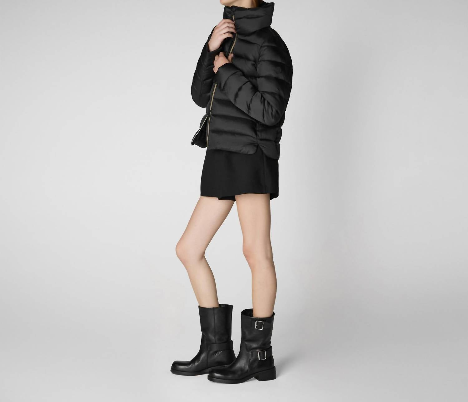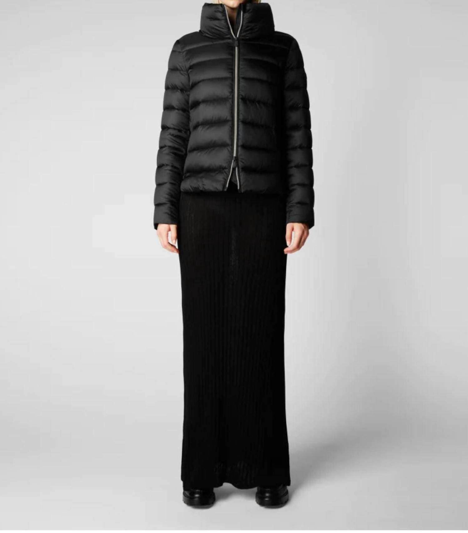 The Elsie Woman's Jacket by SAVE THE DUCK combines a chic quilted design with practical features for the perfect cold-weather outerwear. This long sleeve jacket in solid black is made from a polyester fabric with high collar and gold hardware details. Material: Nylon. Closure: Zip closure. Origin: Made in the USA. Care: Dry clean only. This 3/4 length puffer with front zipper and pockets ensures both style and function.