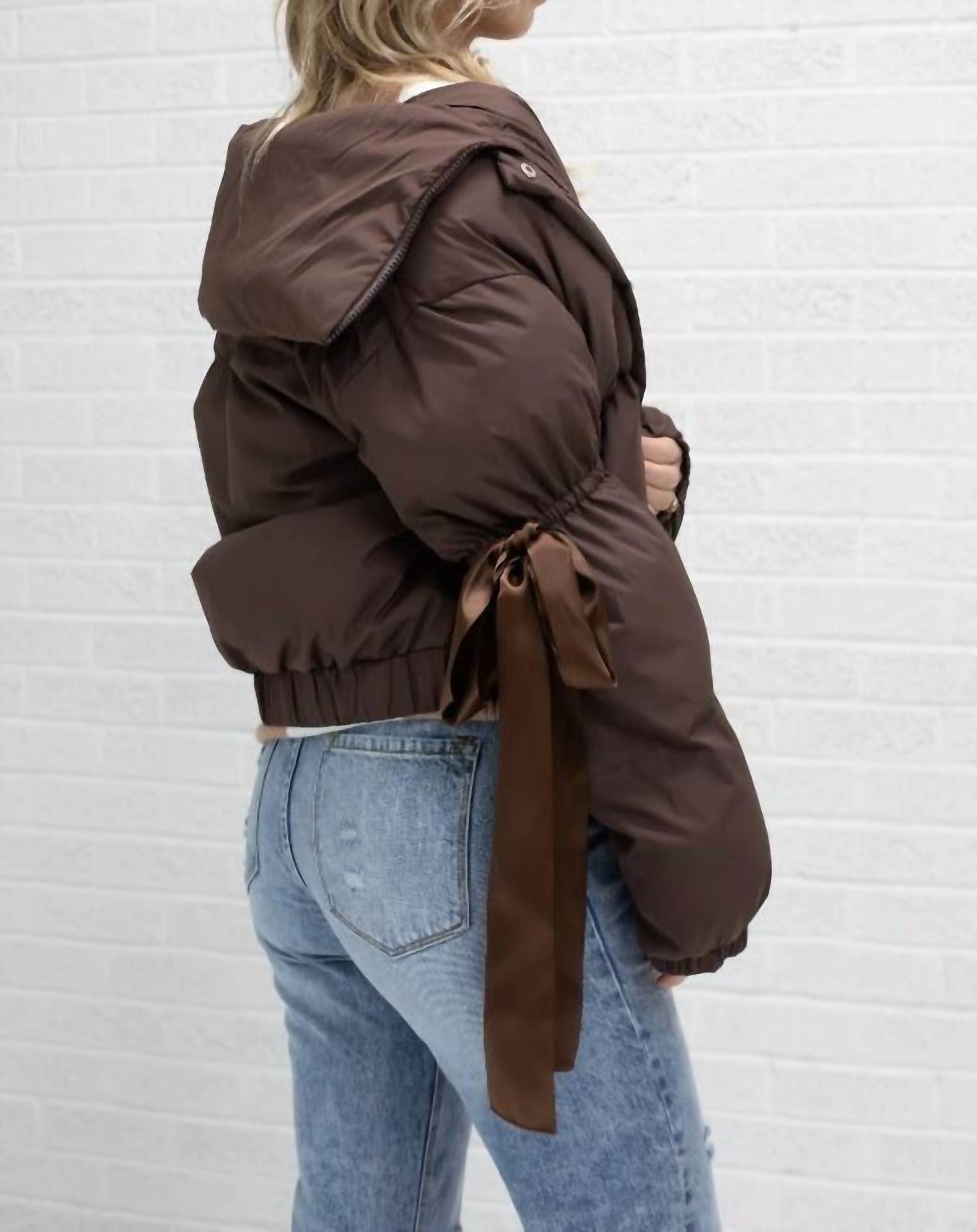 Cooler temps means cute puffer jackets and this one is a fan favorite. Introducing the Aylani Puffer Jacket by Pretty Follies, a chic chocolate-hued addition to your winter wardrobe. With long sleeves and crafted entirely from polyester, this collared jacket offers both warmth and style. It features a unique bow knot elbow string and convenient side pockets, with a zipper and button closure ensuring a secure fit. Perfect for making a quirky, playful statement at holiday parties.