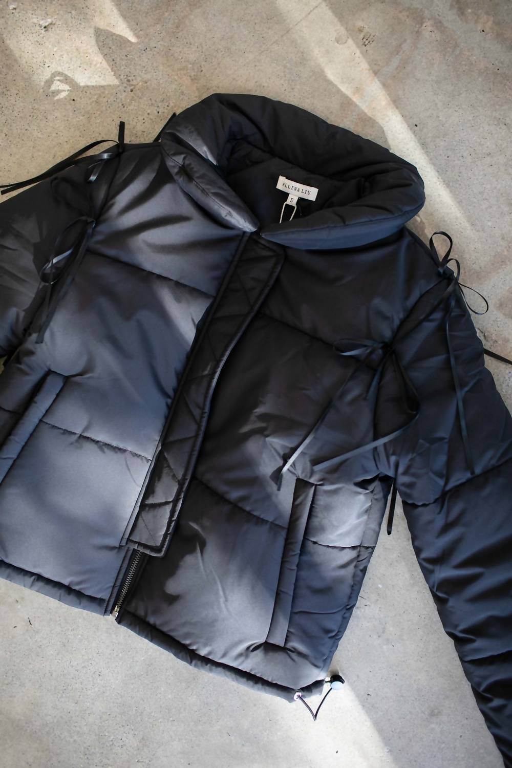 You'll be reaching for this puffer jacket all season long. Meet the Women's Chihiro Jacket by Allina Liu, a chic puffer perfect for winter travels. This solid black jacket features long sleeves with unique shoulder ties and offers a snug fit with a zip and snap front closure. Composed of 100% Polyester, it is important to note the suggestion to size up for better shoulder comfort. Elevate your preppy style effortlessly with this must-have piece.