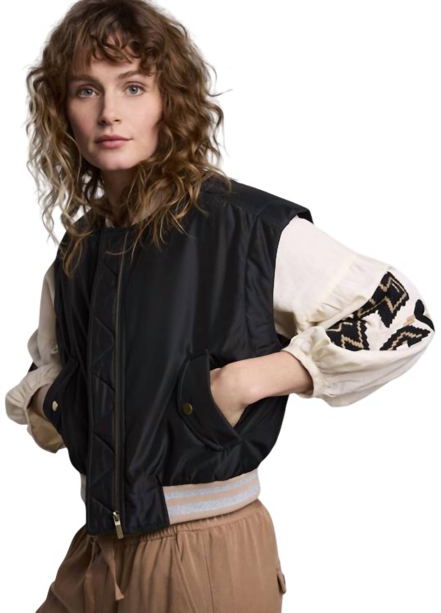 Bodywarmer in sand with subtle sheen and round collar with delicate decoration. Streamlined zipper closure, integrated pockets, and ribbed hem with glittering details.Elegant and versatile design.