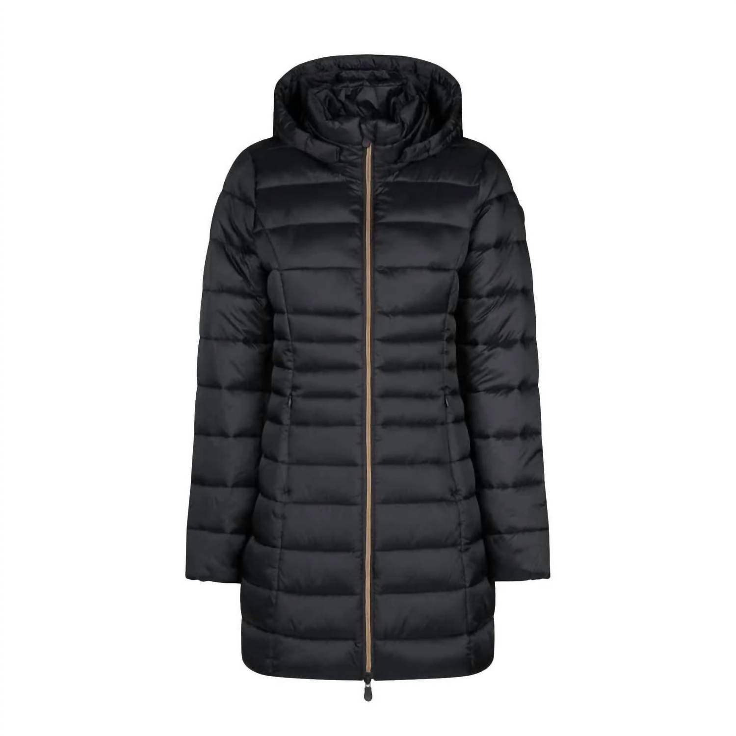 Cozy, cute and timeless. The puffer jacket that will keep you warm all season long. Introducing the Reese 3/4 Hooded Puffer Coat by SAVE THE DUCK, a chic and practical addition to your winter wardrobe. Crafted from durable polyester, this black puffer coat features long sleeves, a cozy removable hood, and stylish gold hardware. Designed with a convenient front zip closure, it offers both functionality and modern style, complete with practical pockets and a lining for added comfort. Proudly made in the USA, this coat demands care and attention with a dry clean only recommendation.