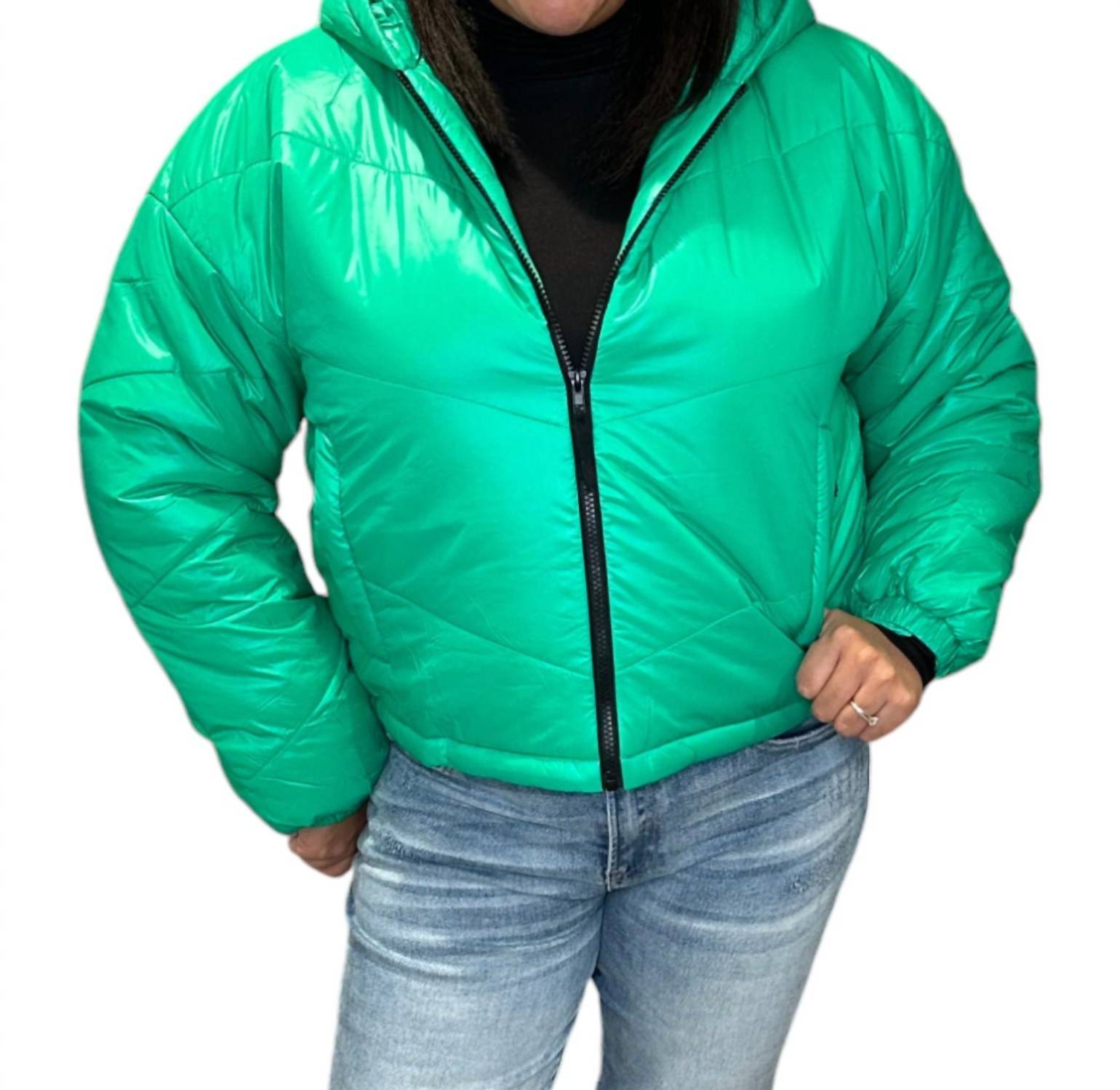 Bold electric green color for a statement-making look. Cropped design adds a modern, edgy vibe. True-to-size fit; size up for layering over heavy sweaters.
