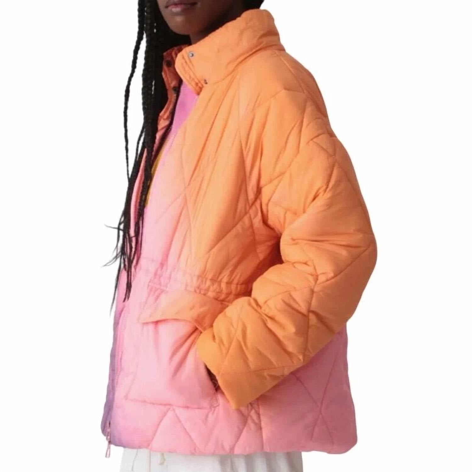 Cozy, cute and timeless. The puffer jacket that will keep you warm all season long. Introducing the Aiden Ombre Quilted Jacket by Electric & Rose, a must-have for the winter season with its dreamy pink, purple, and orange hues. This women's puffer features a stylish stand collar and long sleeves, offering both warmth and a fashionable tie-dye pattern. Crafted from 100% nylon, this jacket measures 28" in length and includes both front flap and side pockets for added convenience. Made with care, it has a front zip closure with a snap storm placket and requires dry cleaning to maintain its exceptional quality.