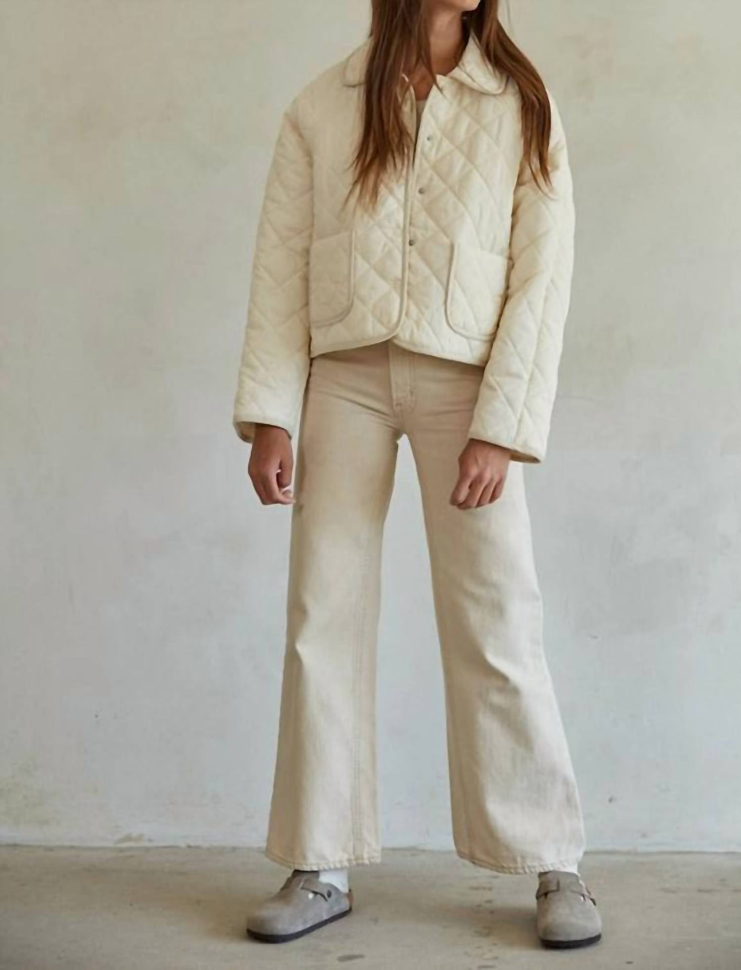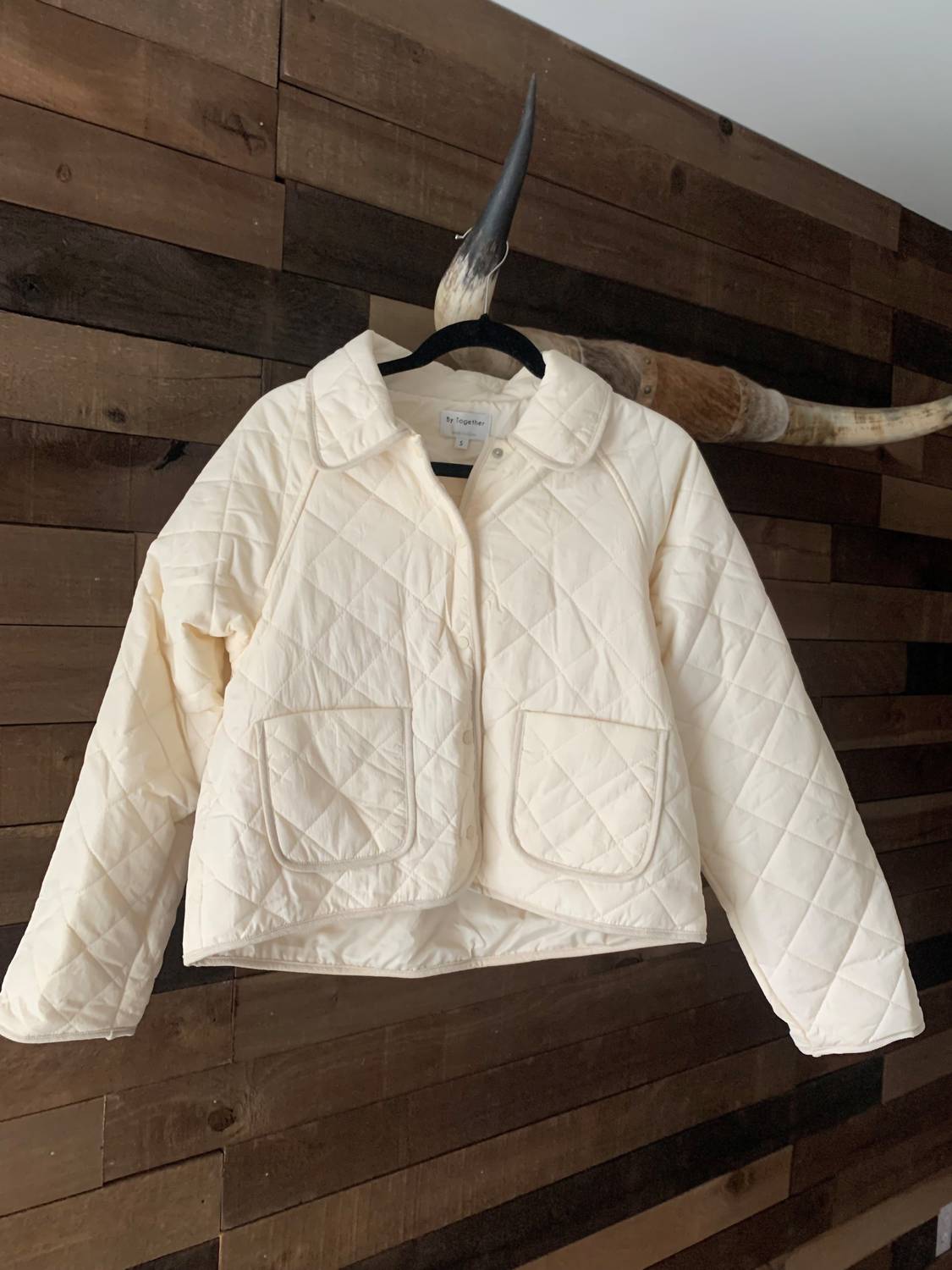 Cozy, cute and timeless. The puffer jacket that will keep you warm all season long. Meet the Anne Woven Cotton Quilted Jacket by By Together, an ideal minimalist layer for cool autumn days. With long sleeves and composed of an 85% cotton and 15% polyester blend, this lightweight jacket offers a comfortable fit. The garment features a solid cream design and a snap closure for easy wear, complemented by practical front pockets. Care instructions recommend machine wash and allowing to tumble dry, making it convenient for everyday use.