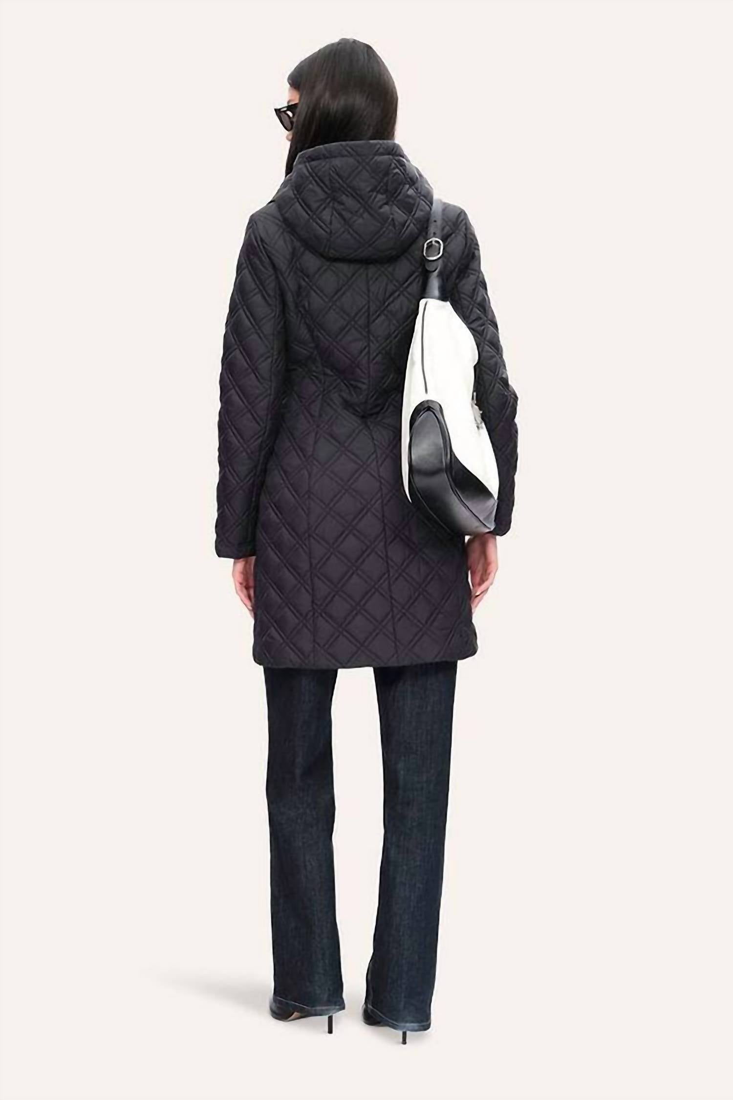 Cozy, cute and timeless. The puffer jacket that will keep you warm all season long. This lightweight mid-length puffer coat features diamond-quilted stitching in water-resistant silky taffeta. It has an attached hooded bib and a zip front closure. The inner shell and fill are 100% polyester. The coat runs true to size; the model is 5'10" and wears size S. It is imported and dry clean only. Style number 124001278.