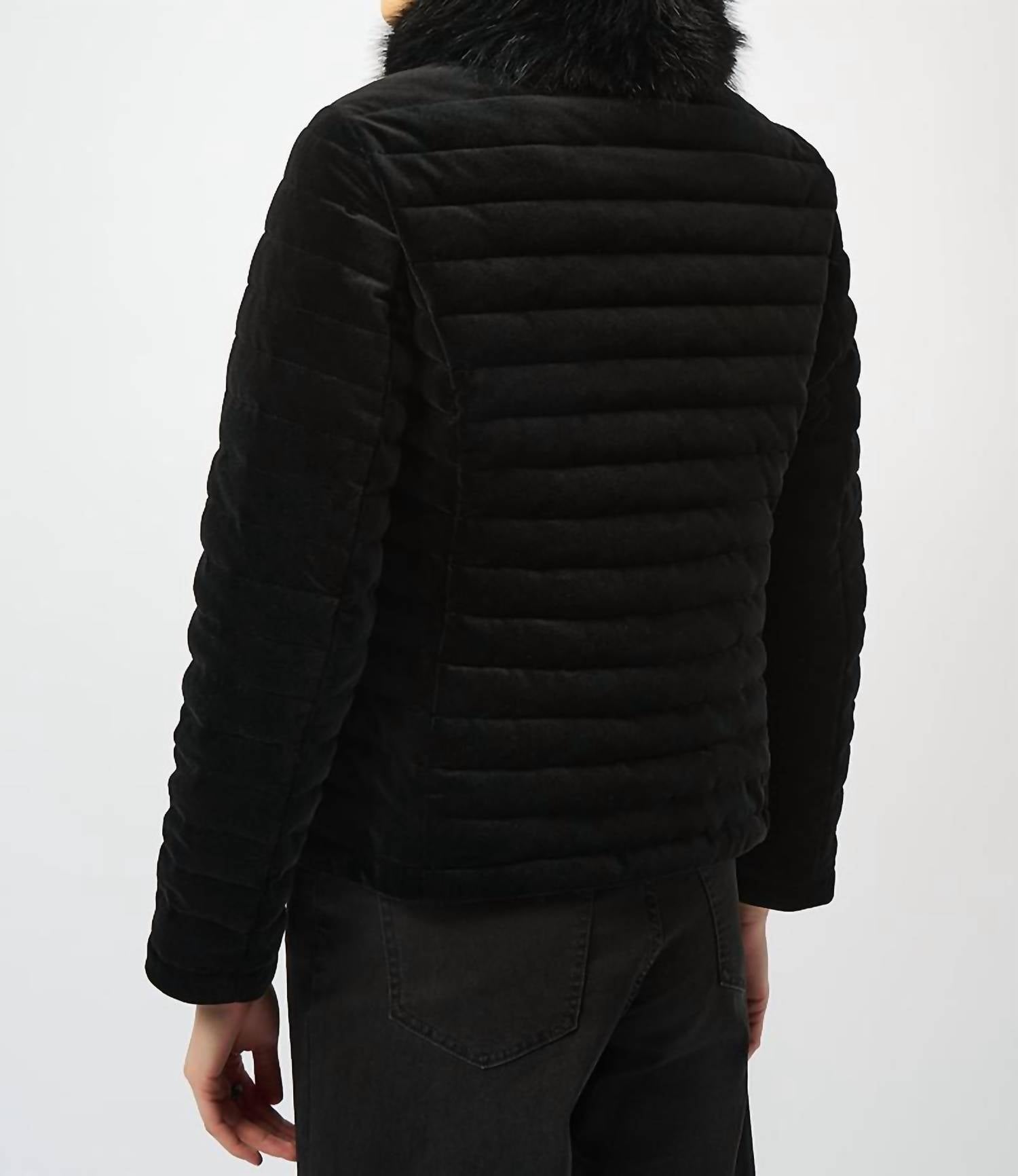 You'll be reaching for this puffer jacket all season long. Experience elegance with the Velvet Puffer Coat by Joseph Ribkoff, a sophisticated choice for the monochrome trend this Fall. Crafted from a luxurious blend of 95% Polyester and 5% Spandex, this coat features long sleeves and a detachable faux fur collar that add a touch of glamour. Made with a fitted silhouette, it includes practical rhinestone zip slash pockets and a front zip closure. Care for this textured black puffer with dry clean only, and enjoy its versatility on your Thanksgiving getaway.