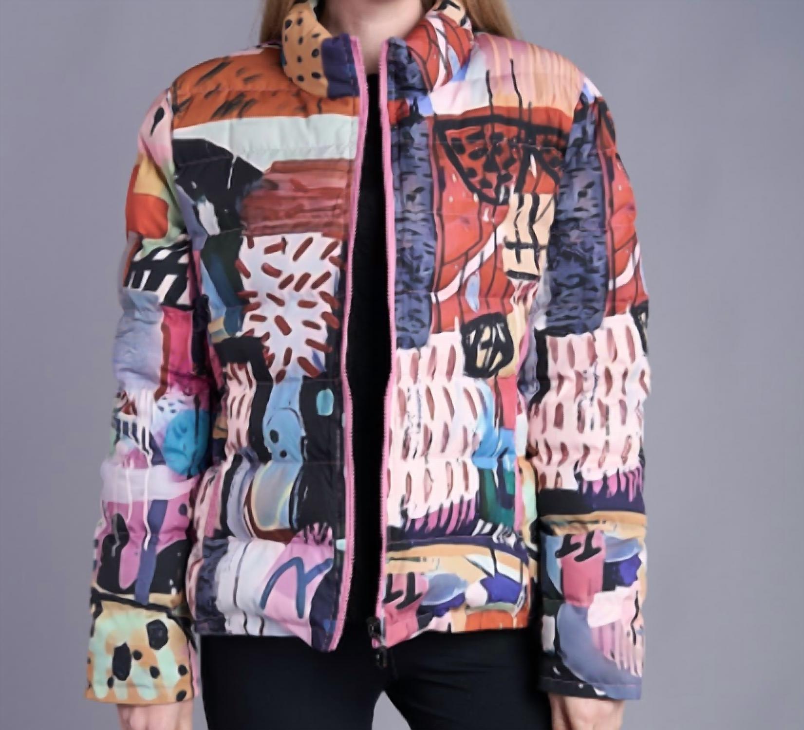 You'll be reaching for this puffer jacket all season long. Discover warmth and style with the Printed Puffer Jacket by Shana Apparel, designed for women. This blue puffer features a long sleeve design and a striking graphic pattern, perfect for winter outings. The jacket includes a practical zip closure and a snug mockneck, adding both function and fashion to your winter wardrobe. With its convenient pockets, this puffer not only stands out but also caters to your daily needs.