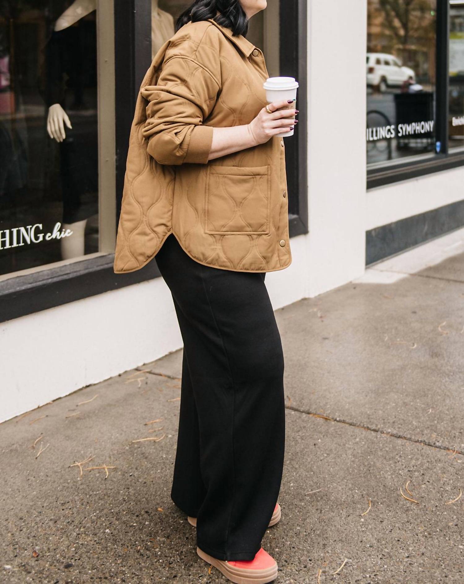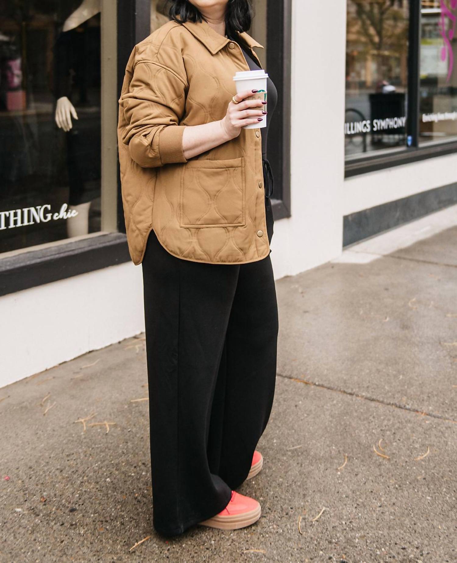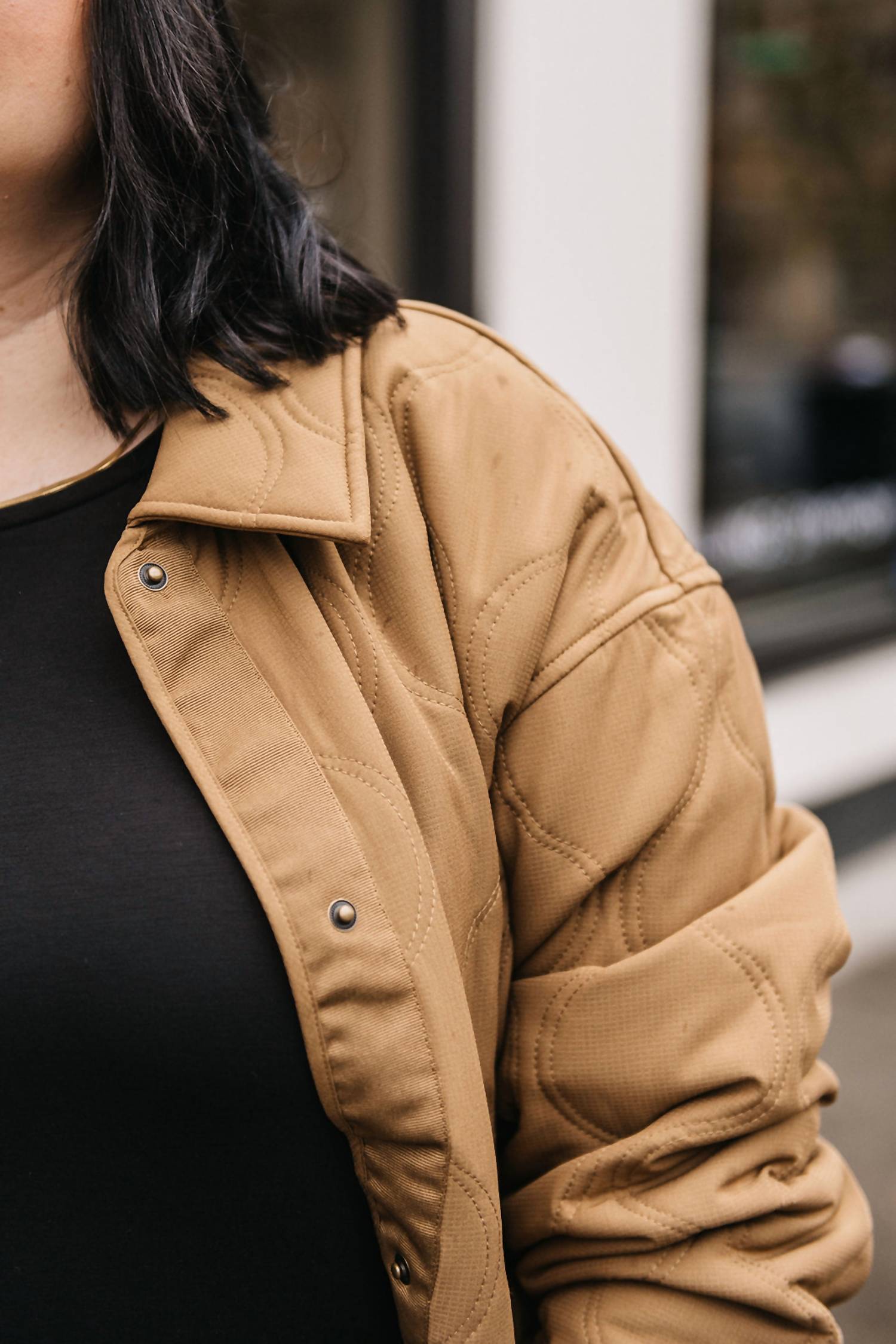 Cozy, cute and timeless. The puffer jacket that will keep you warm all season long. Elevate your cool-weather ensemble with the Quilted Puffer Jacket by Z Supply, presented in a versatile khaki hue. This midweight jacket features long sleeves, a collared neckline, and an oversized fit, offering both style and warmth. Crafted from 90% Polyester and 10% Spandex, it boasts a snap closure and is perfect for travel and fall occasions. Designed with practicality in mind, it includes patch pockets and moisture-wicking properties. Care: Dry clean only.