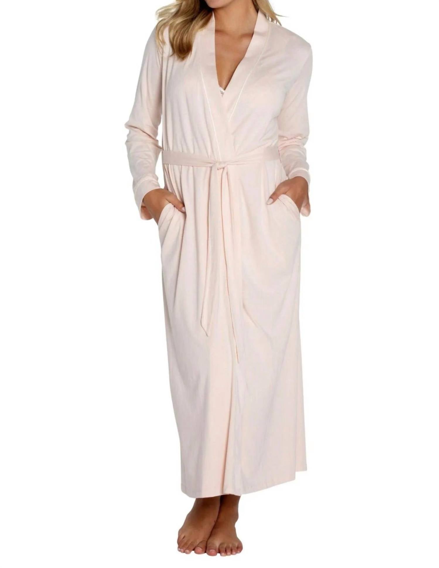 When comfort and style come together seamlessly. Embrace luxurious comfort with the Alissa Lightweight Full Length Robe by Twelve Eighty Eight, in a beautiful Heavenly Rose hue. Designed with long sleeves and a flattering wrap style, this robe features a soft cotton blend material and a full length of 54 inches, for an elegant fit that hits at or slightly above the ankle. Its inside tie and sewn-in belt provide a customized fit, while hidden side pockets offer both style and practicality. Perfect for snuggling up in quality and style, this solid pattern piece is a must-have for any wardrobe.
