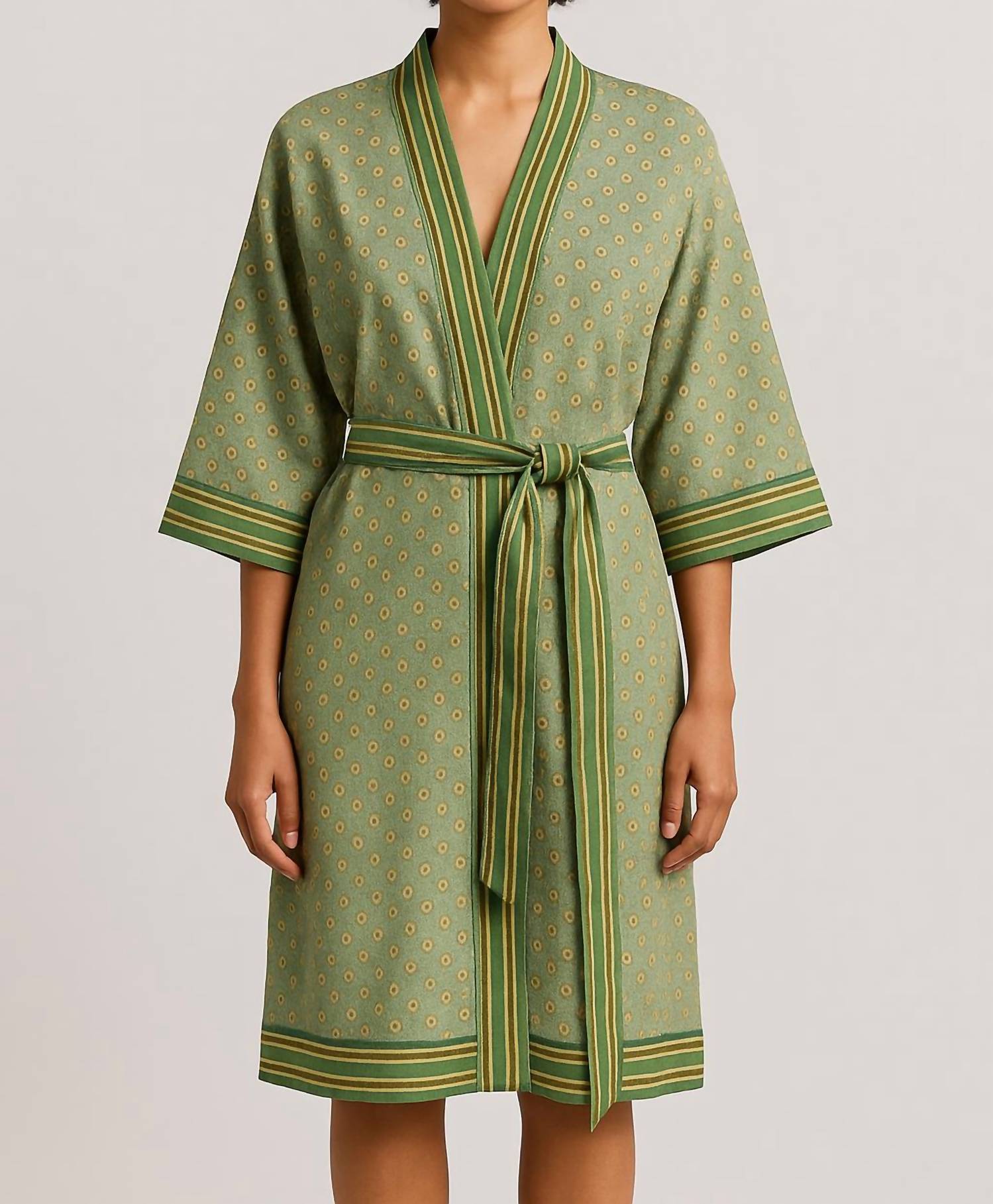 Introducing the Three-quarter Sleeve Printed Robe by Hartwick Atelier in a beautiful sage hue, perfect for adding a touch of natural elegance to your wardrobe. Crafted in India from 100% cotton, this robe features a graphic pattern and a flattering V-neckline, combining artisan craftsmanship with sophisticated style. Its breathable material offers exceptional comfort, making it an ideal choice for vacation wear. Care is simple with machine washable instructions, ensuring easy maintenance for everyday use.