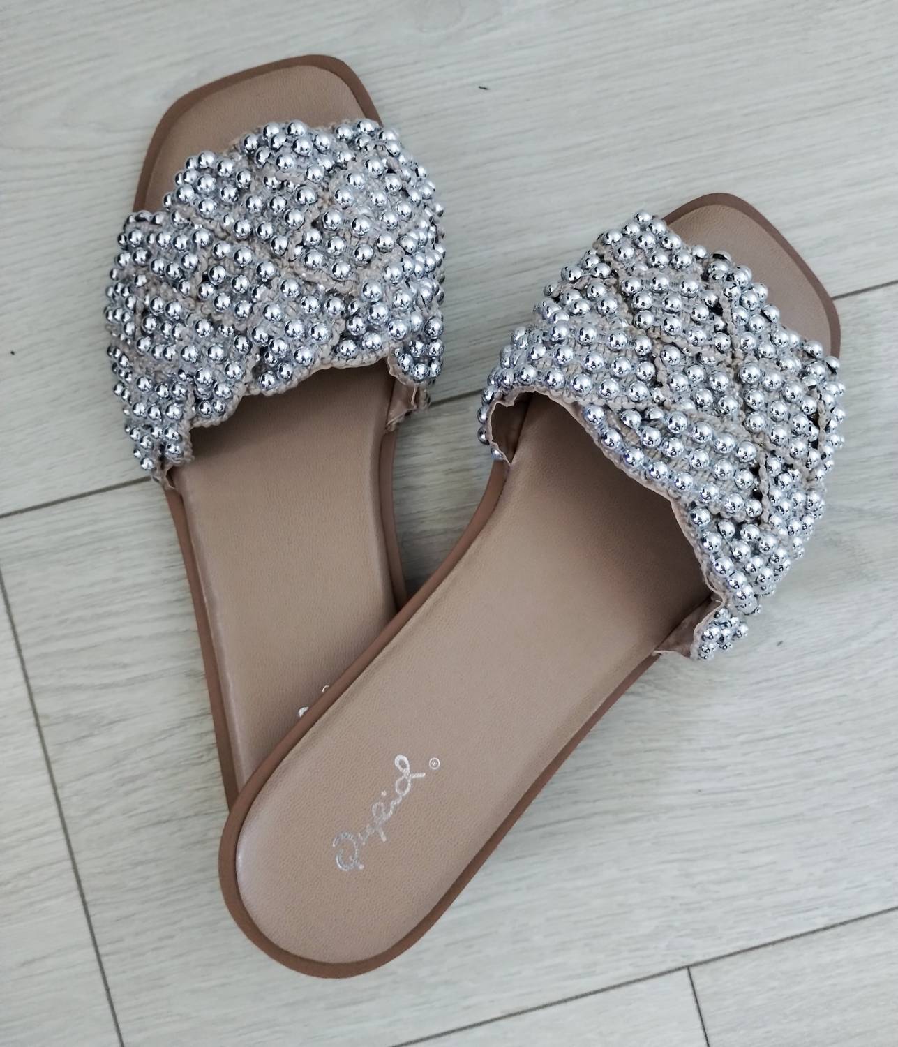 Nude Knitted Slides [IDRIS-01] with Silver Rhinestone stud details! Very neutral!