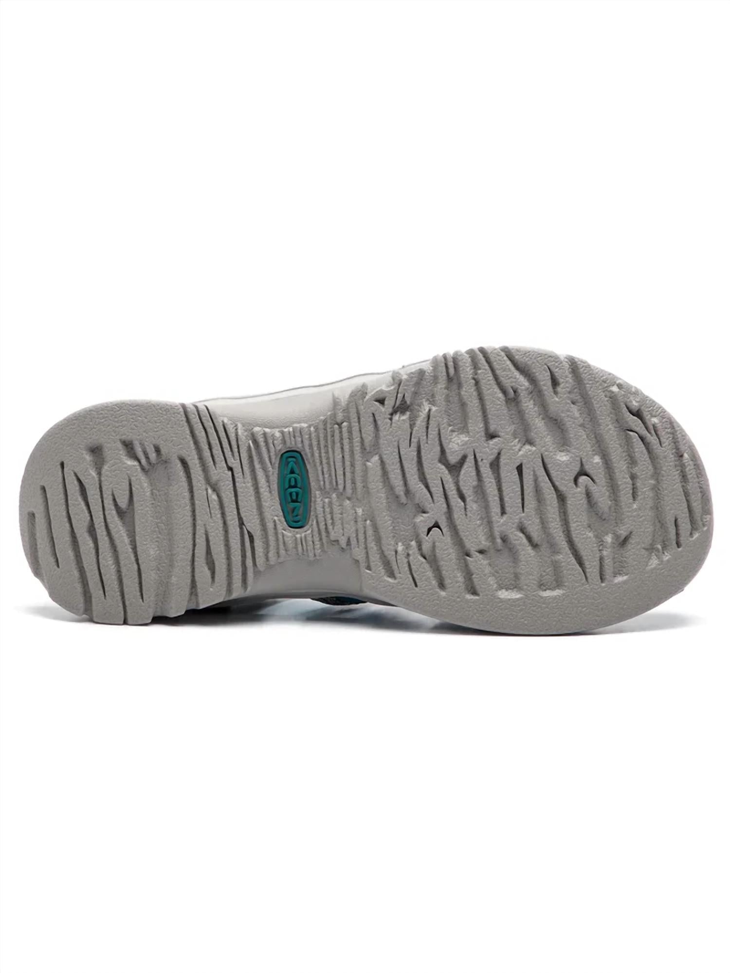 Flowy dresses, cropped pants, and even jumpsuits... this sandal works with them all! Step into adventure with the Keen Women's Whisper Closed Toe Sandals in a playful Canton/bayou colorway. These lightweight sandals feature an elastic closure system for a customized fit and boast a quick-drying polyester upper for easy maintenance. The contoured footbed, crafted from EVA with KEEN technologies like Metatomical Footbed and KEEN Dry Waterproof, ensures all-day comfort and support. Designed for long hikes or waterfront activities, the non-marking outsole offers excellent shock absorption and grip.