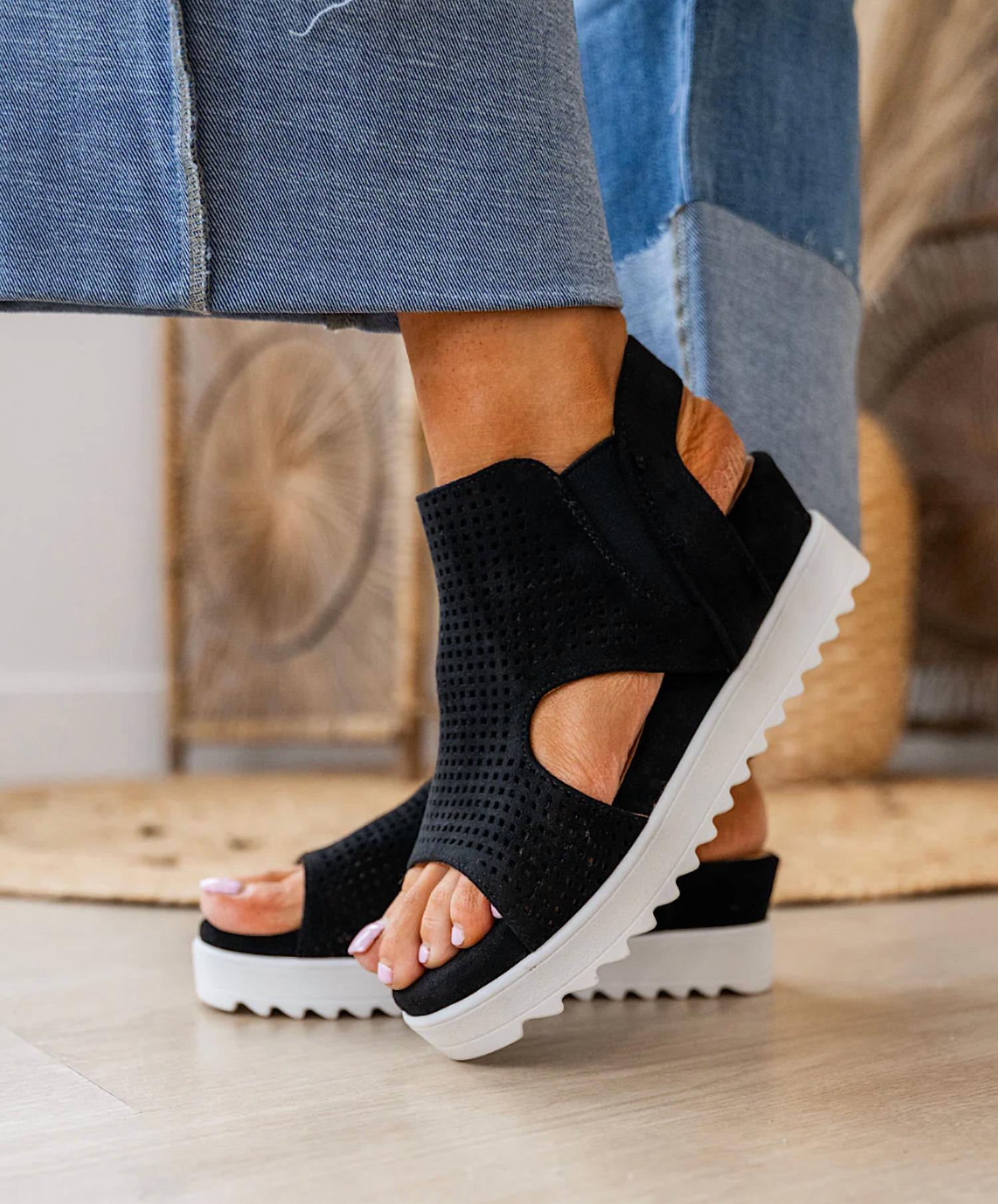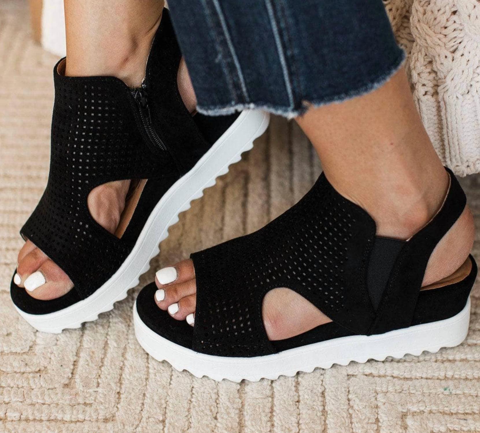 This sandal will take you from brunch to dinner and everything in between. Introducing the Very G Women's Amy 2 Wedge Sandals in classic black, a perfect blend of style and comfort. These sandals are crafted from faux suede with a perforated upper for breathable wear. Featuring a platform wedge heel with a low height of 1 1/4" to 2", they ensure stability and a subtle lift. The functional side zipper and elasticized inset provide secure and easy wear, while the open toe design suits the summer season's streetwear trend effortlessly.