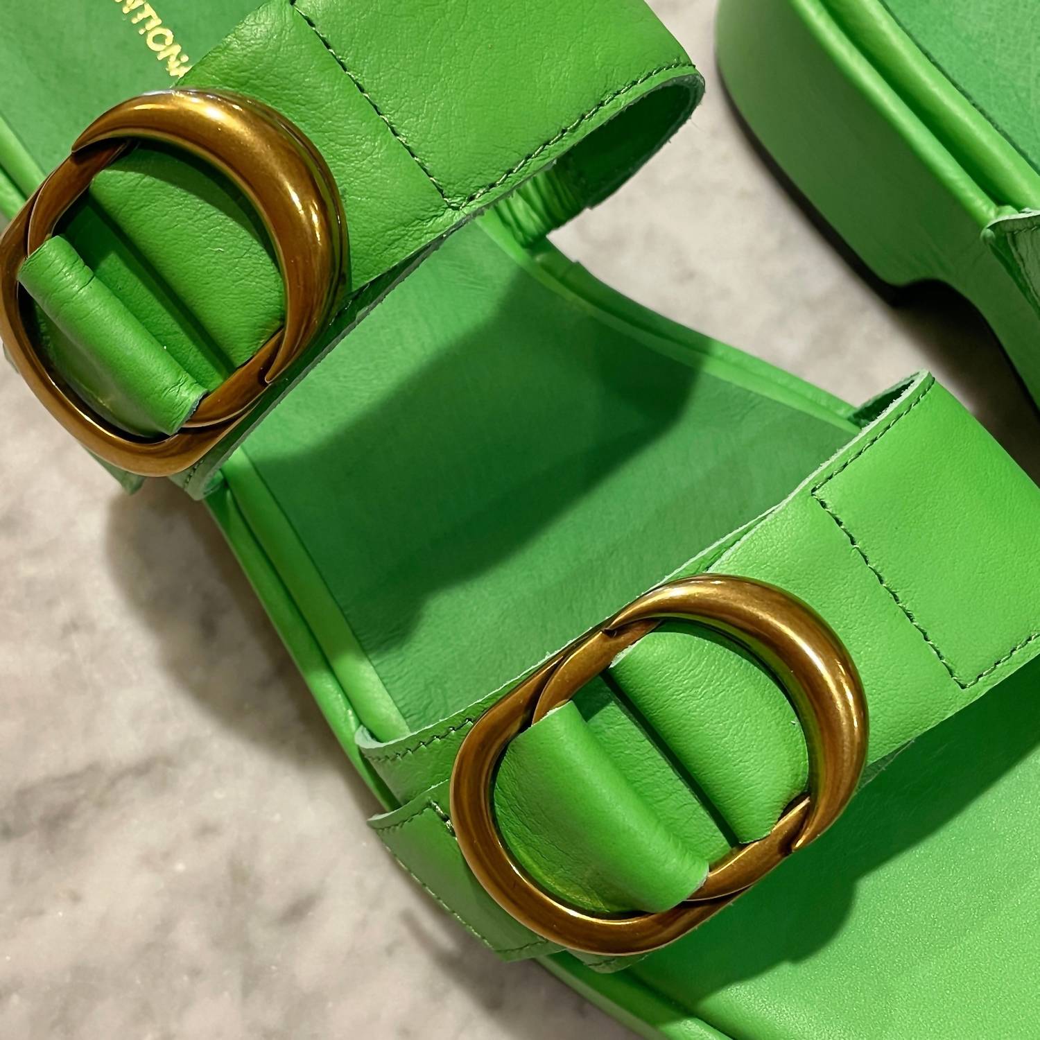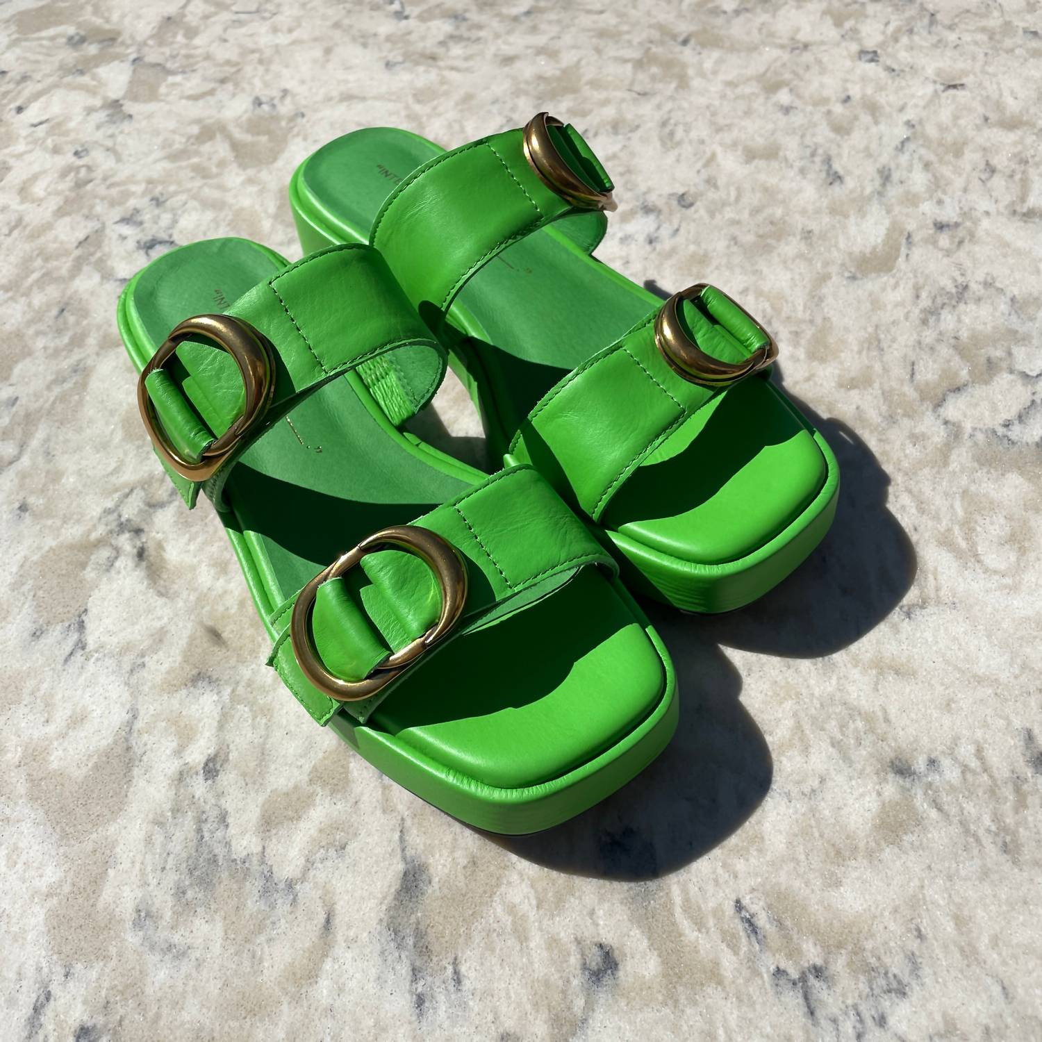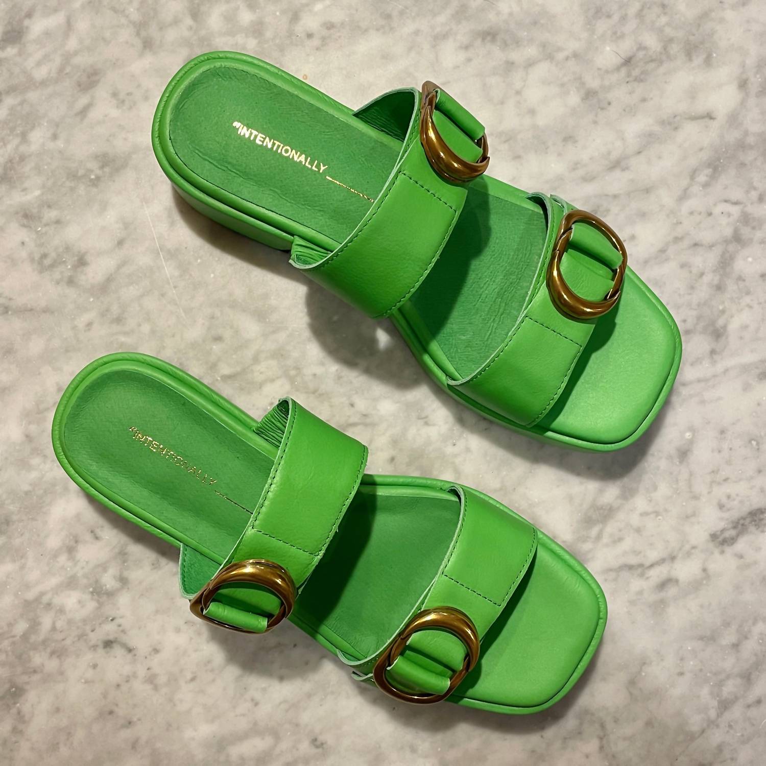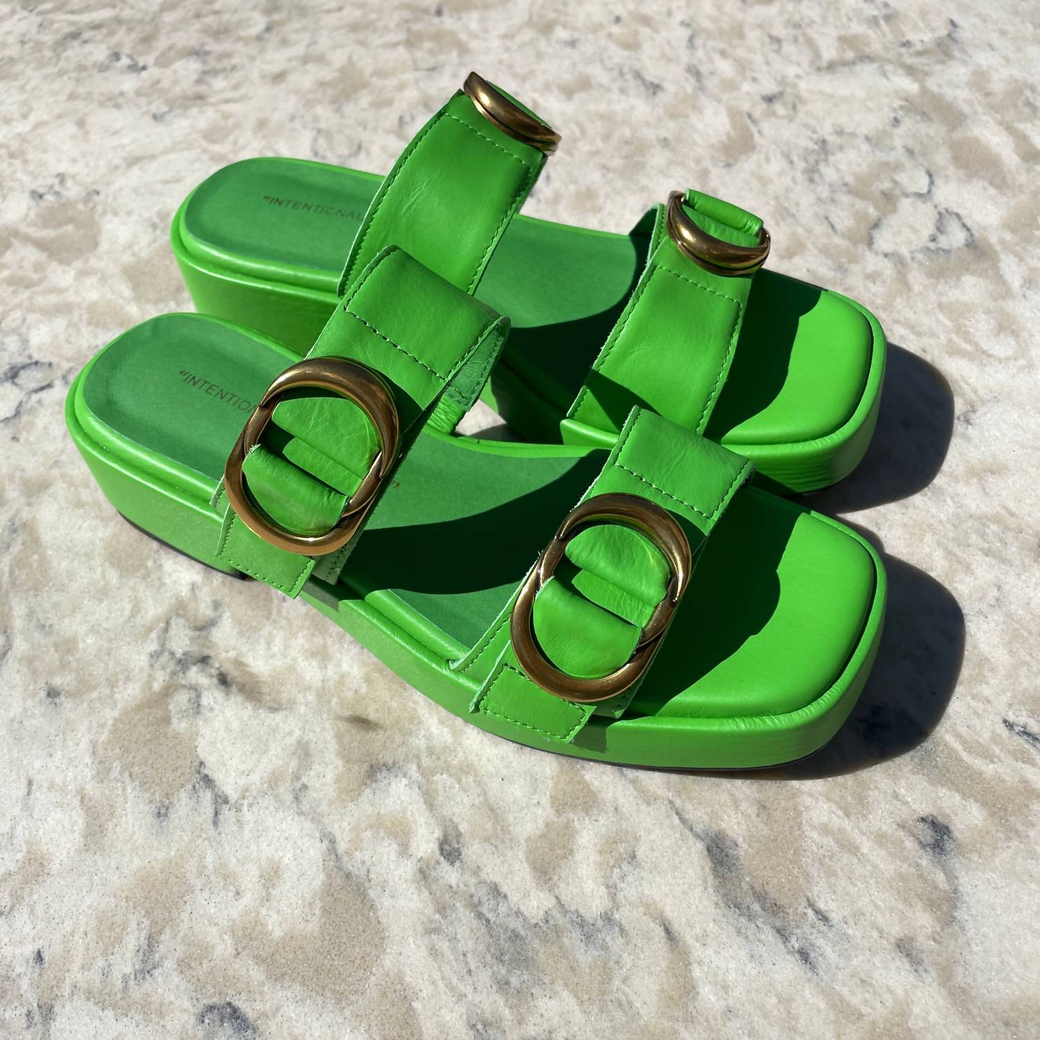 Classicly cute and all-day-wearable. We love this sandal. Discover the Women's Orion Sandal by INTENTIONALLY BLANK, a chic and comfortable choice in a vibrant verde shade. This slip-on two-band sandal features an open toe with a mod-inspired design, crafted from a leather upper and lining for a luxurious feel. The memory foam footbed ensures a comfortable fit, and the sandal rests on a low block heel, perfect for stylish summer dinner parties. Made in China, these sandals are true to size and embody a minimalist trend ideal for St. Patrick's Day celebrations.