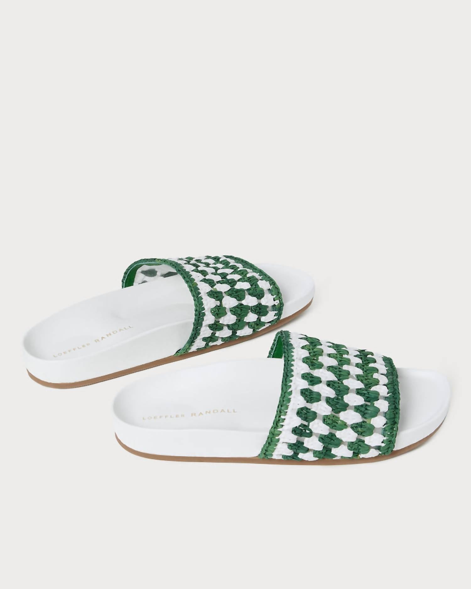This sandal will take you from brunch to dinner and everything in between. Step into summer style with the Women's Henri Crochet Sandal by Loeffler Randall, featuring an eye-catching green and white crocheted leather design. The sandal offers a comfortable fit with its padded leather footbed and tonal leather sole, complemented by an easy open toe slip-on style. Material: Rubber. Perfect for vacation and streetwear occasions, these sandals are a summer essential.