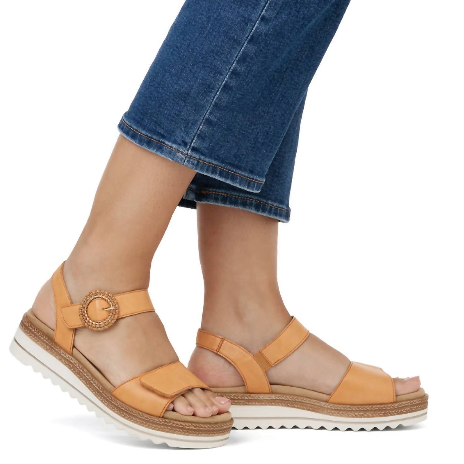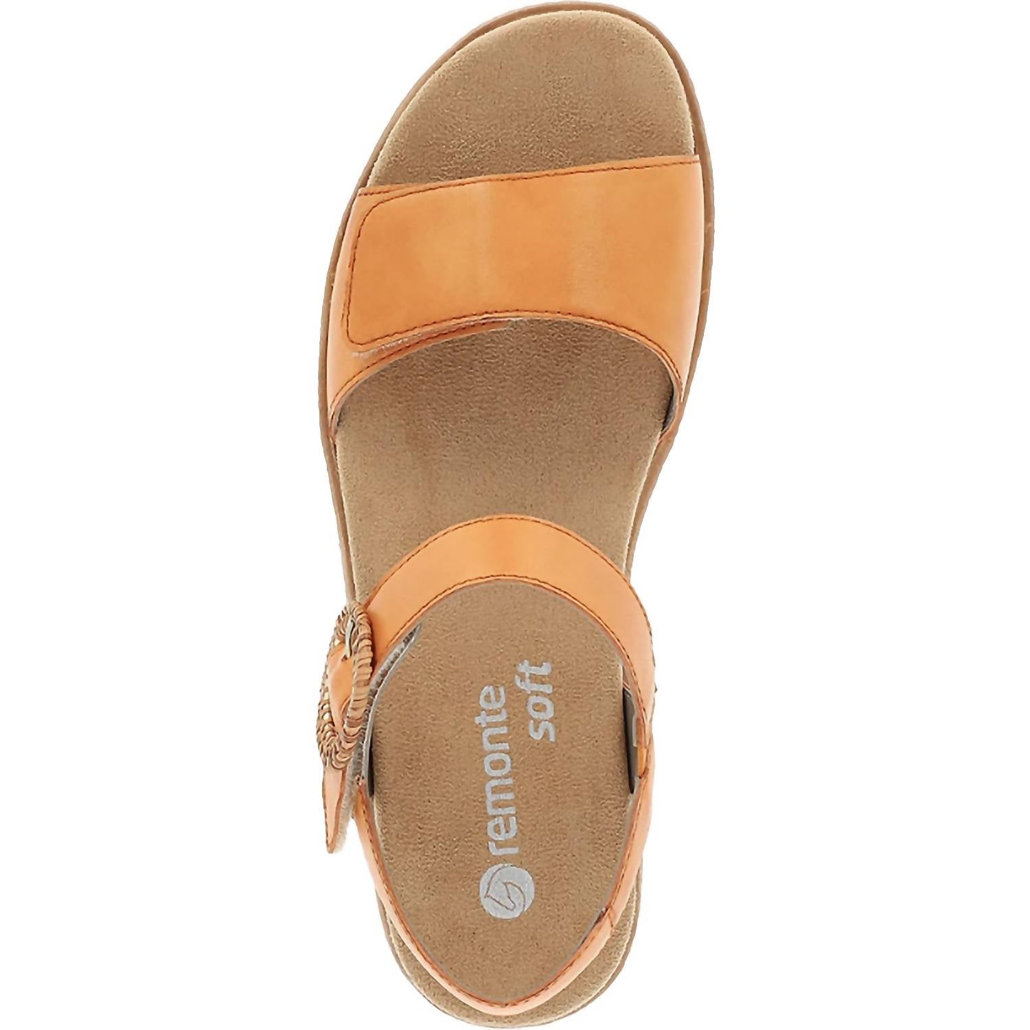 Step into effortless style with the Remonte Women's Jocelyn 52 Platform Sandals in vibrant Mandarin Leather. Crafted with a leather upper and a combination of synthetic and textile lining, these sandals offer both durability and comfort. Designed with two adjustable straps for a custom fit and a chic decorative buckle accent, they sit atop a 1.5" platform heel. Ideal for summer engagements, these sandals feature a round toe shape.