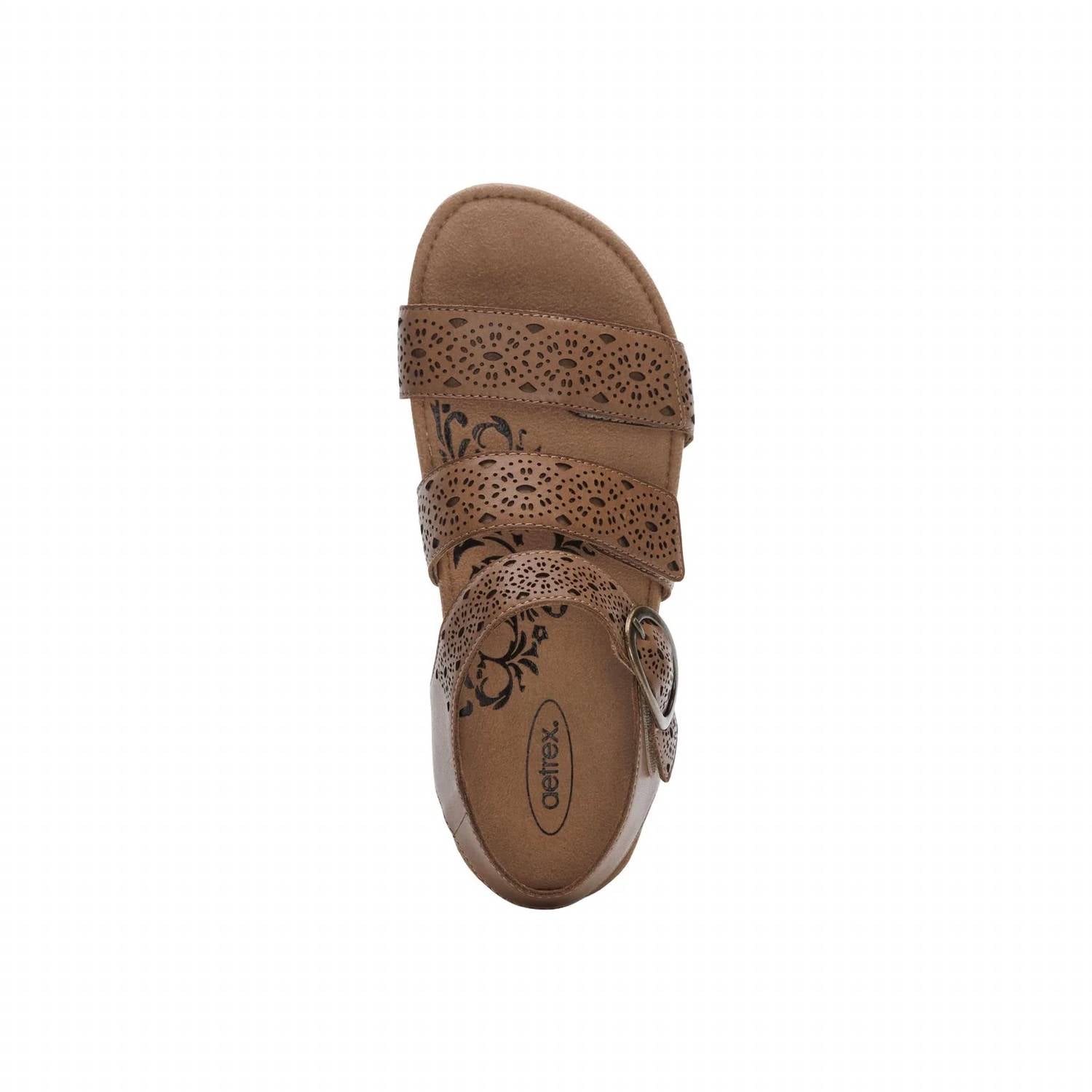 This sandal will take you from brunch to dinner and everything in between. Step into summer elegance with the Women's Lilly Cutout Sandals by Aetrex, tailored for vacation-ready comfort and style. These vintage-inspired sandals showcase a chic genuine leather upper in versatile taupe, complemented by an open toe design. Engineered for comfort, they feature memory foam footbeds for superior cushioning and excellent arch support. The hook and loop closures offer a customizable fit, ensuring these sandals are perfect for all-day wear.