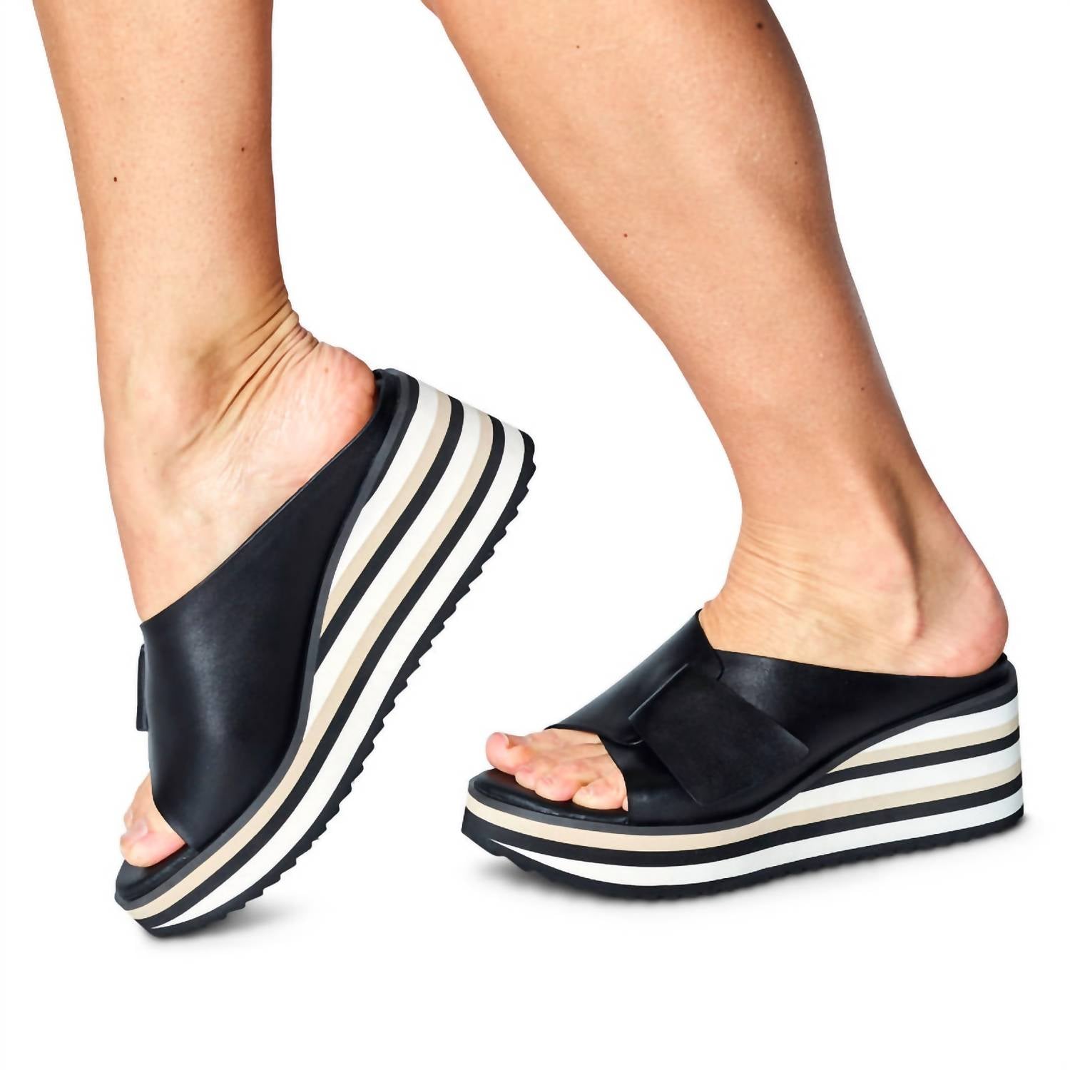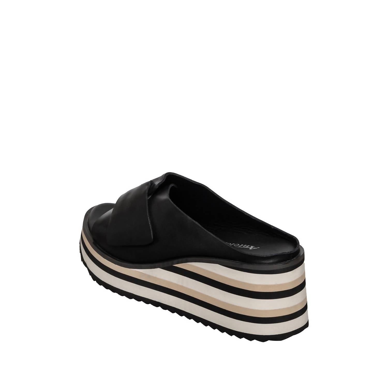 Classicly cute and all-day-wearable. We love this sandal. Step out in style with the Women's Padme Sandals by Antelope, crafted for those who love to make a bold statement. These black mules boast a 3-inch sculpted platform with an open toe design and are adorned with an elegantly knotted bow. Made from premium leather, the upper is luxuriously oiled, and the soft latex-cushioned insole ensures comfort throughout the day. Perfect for elevating any outfit, they are a chic addition to any woman's wardrobe.