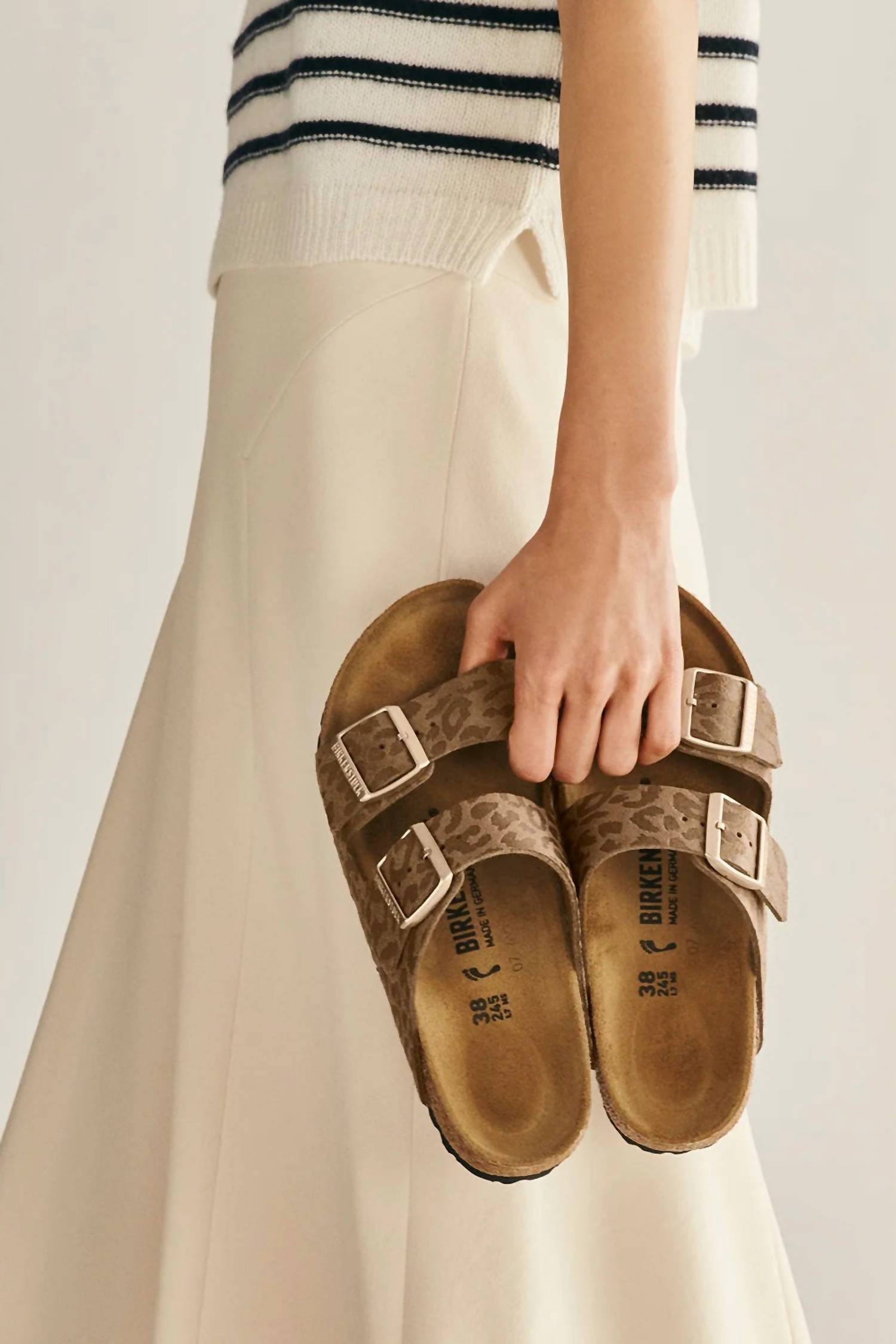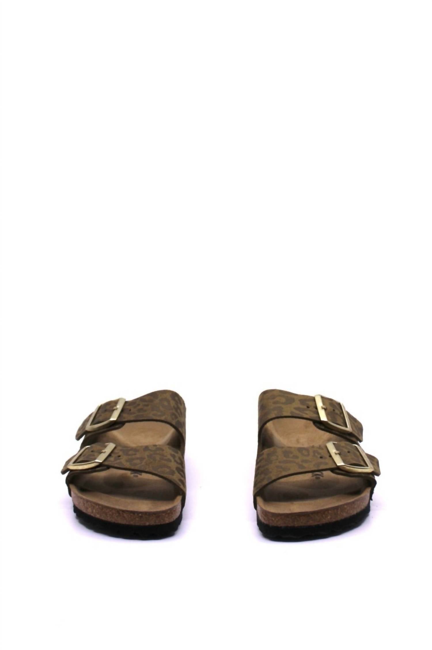 Flowy dresses, cropped pants, and even jumpsuits... this sandal works with them all! Discover the Birkenstock Women's Arizona Sandals in a bold Leo Khaki finish, offering a modern take on an iconic silhouette. These sandals feature two adjustable straps with metal pin buckles and a high-quality synthetic or leather-like upper, ensuring a personalized fit. For unmatched support and comfort, they boast an anatomically shaped cork-latex footbed, complemented by a soft suede lining and lightweight EVA outsole. Perfect for summer occasions, these sandals effortlessly blend timeless design with contemporary flair in a narrow fit.
