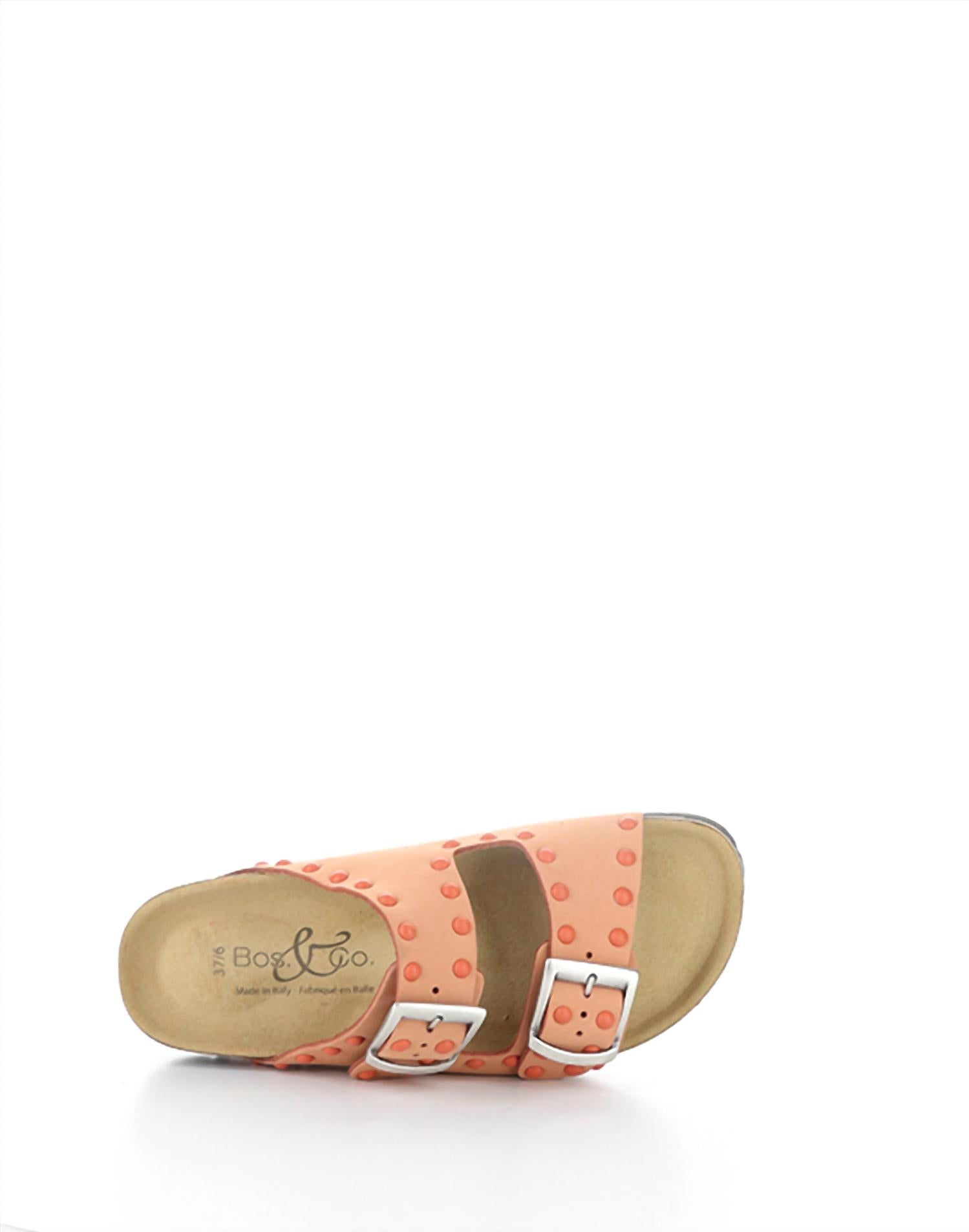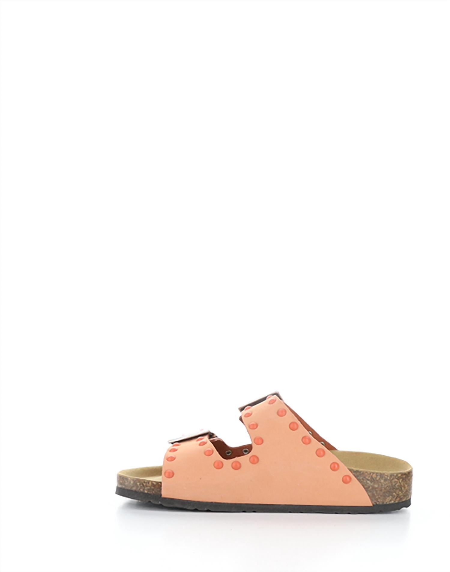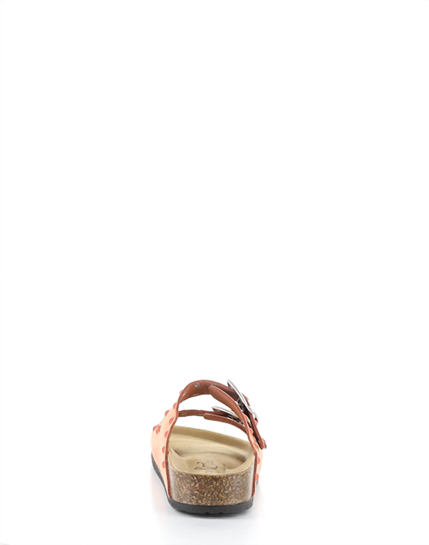 Flowy dresses, cropped pants, and even jumpsuits... this sandal works with them all! Introducing the Women's Perrin Sandals by Bos. & Co., a luxurious addition to any summer wardrobe. Made in Italy, these sandals feature a genuine leather upper adorned with real nail heads. They offer ultimate comfort with a cork-wrapped flexible sole, a 1.25-inch heel, and a 0.75-inch forepart, along with a heel-to-toe cushion insole. The peach nubuck color and open toe design make this buckle strap sandal an elegant choice for vacation or Thanksgiving outings.