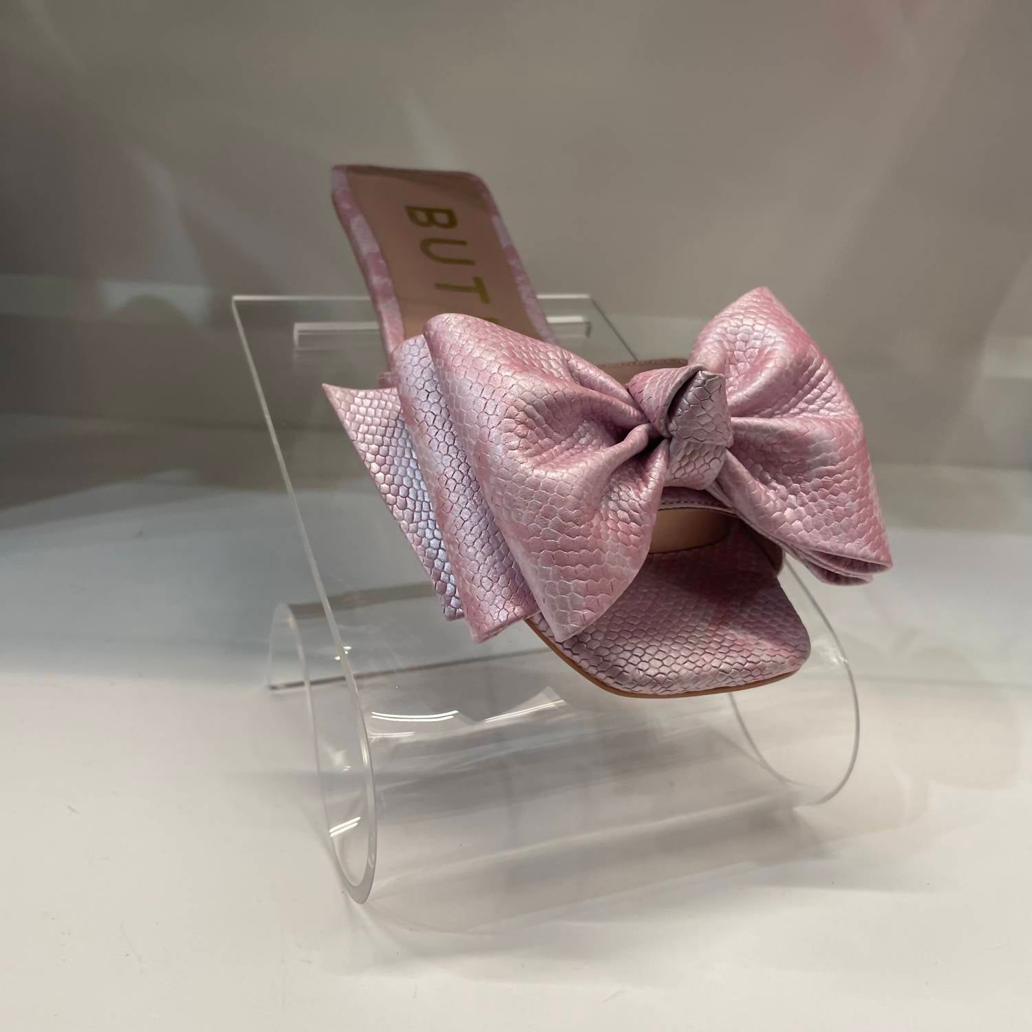 Flowy dresses, cropped pants, and even jumpsuits... this sandal works with them all! The Butrich Daniela shoe is a stylish heeled mule featuring a prominent bow detail and a textured, likely metallic pink, finish.