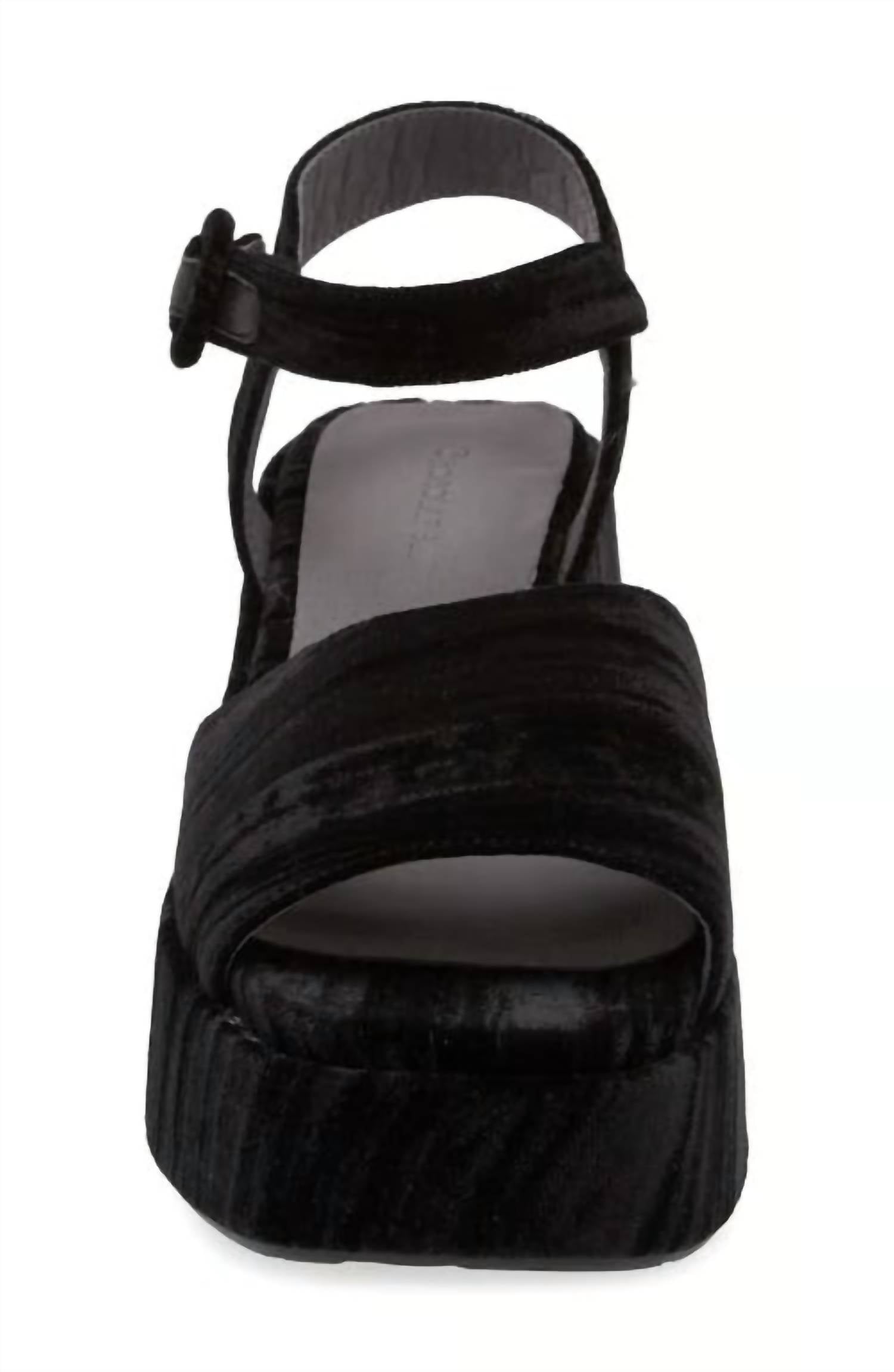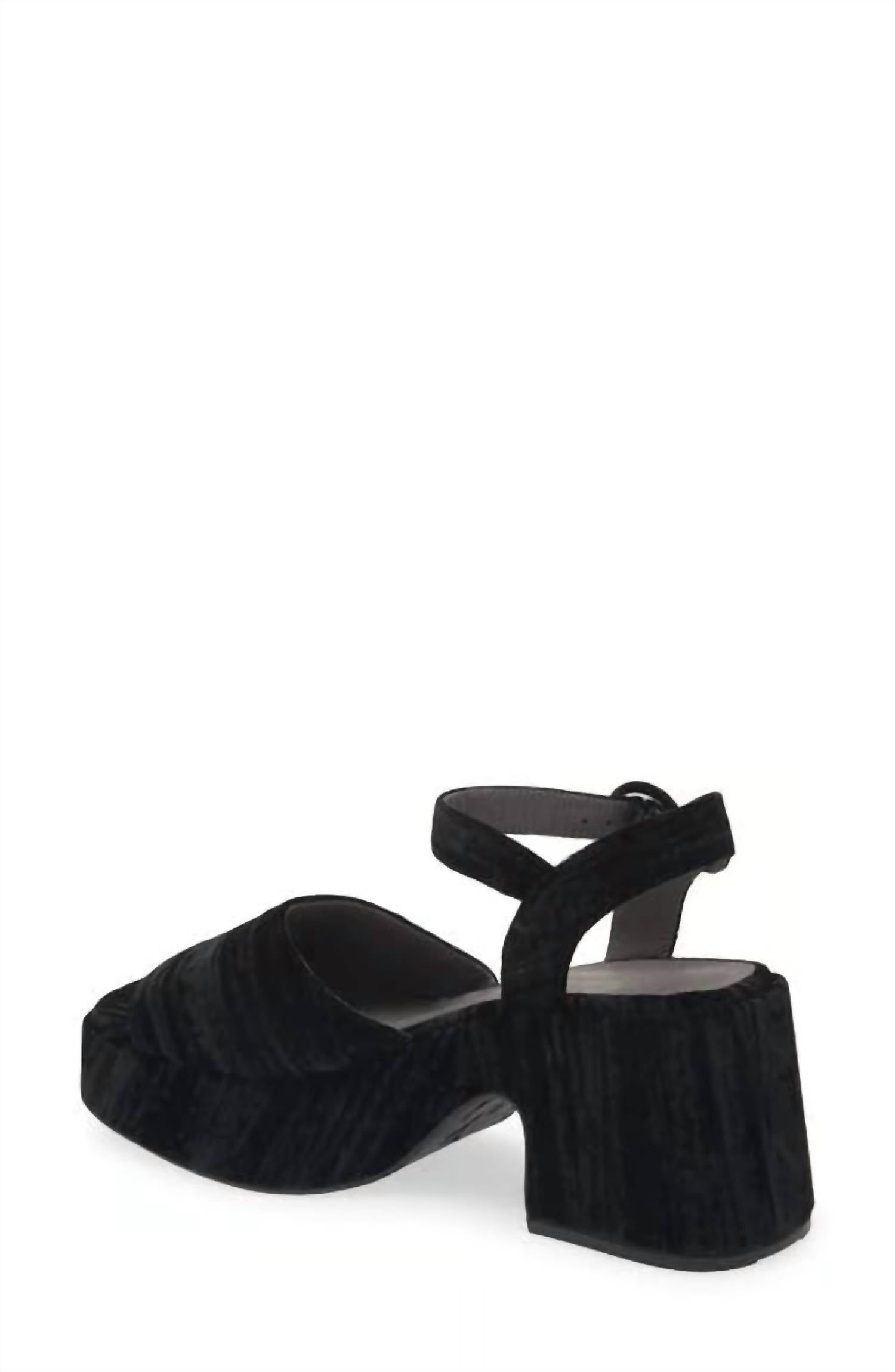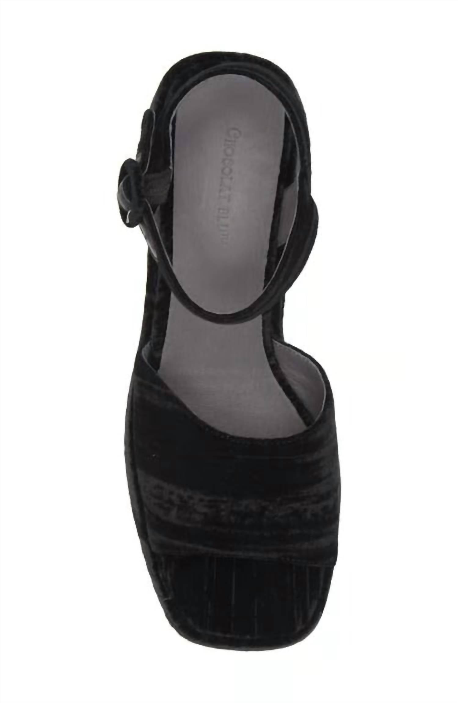 This sandal will take you from brunch to dinner and everything in between. Elevate your wardrobe with the Women's Helga Sandals by Chocolat Blu, crafted in sumptuous Black Velvet. Featuring a chunky platform with a block heel, this stylish sandal has a 3.5-inch heel and a 1.5-inch platform for comfortable elevation. The sandal boasts a plush velvet upper, leather lining, and durable rubber sole, ensuring long-lasting quality. Closure: Adjustable ankle strap with buckle.