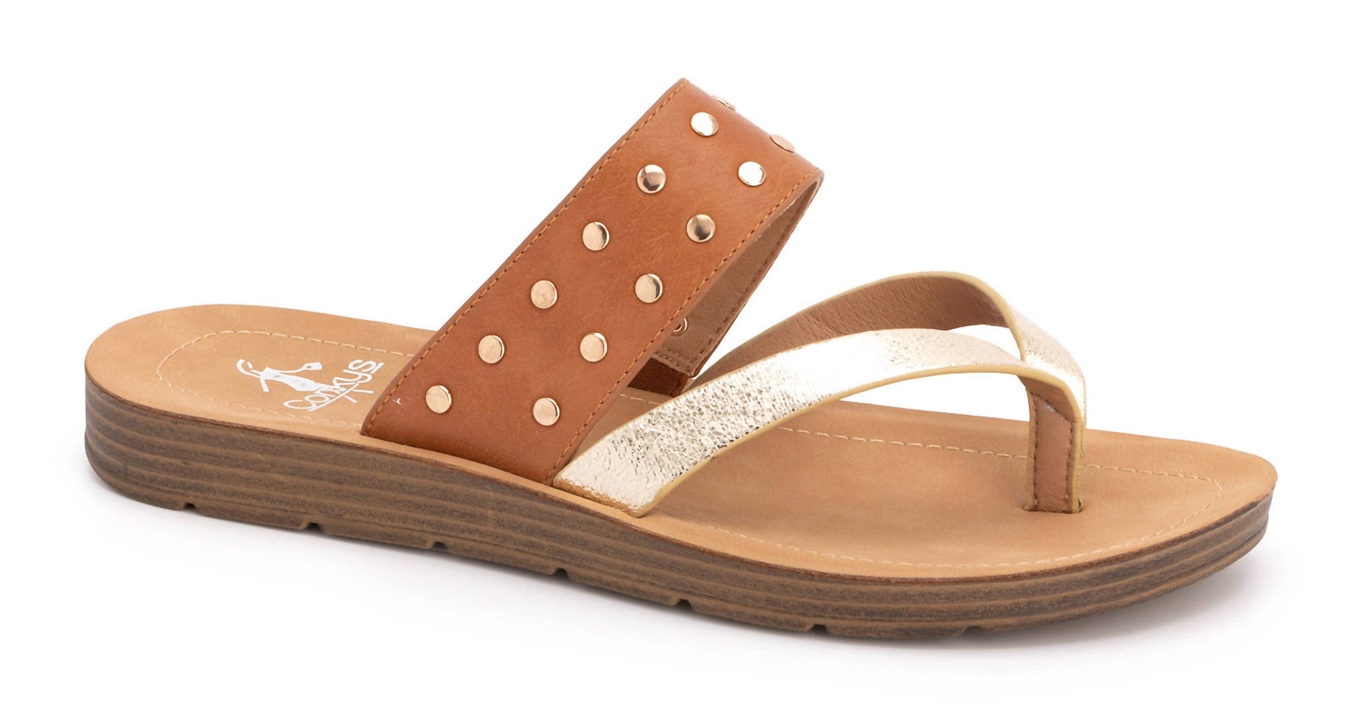 This sandal will take you from brunch to dinner and everything in between. Step into sunny style with Corkys Women's "Good Luck" Sparkling Thong Sandals in Cognac. These summer-ready sandals boast an open toe design with shimmering gold stud details on rich cognac straps, complemented by a flexible EVA material for unmatched comfort. Designed with a flat heel and easy slip-on thong construction, these sandals promise all-day wearability and versatility. Don't hesitate to complete your warm-weather wardrobe with a pair that blends eye-catching elegance and practicality effortlessly.