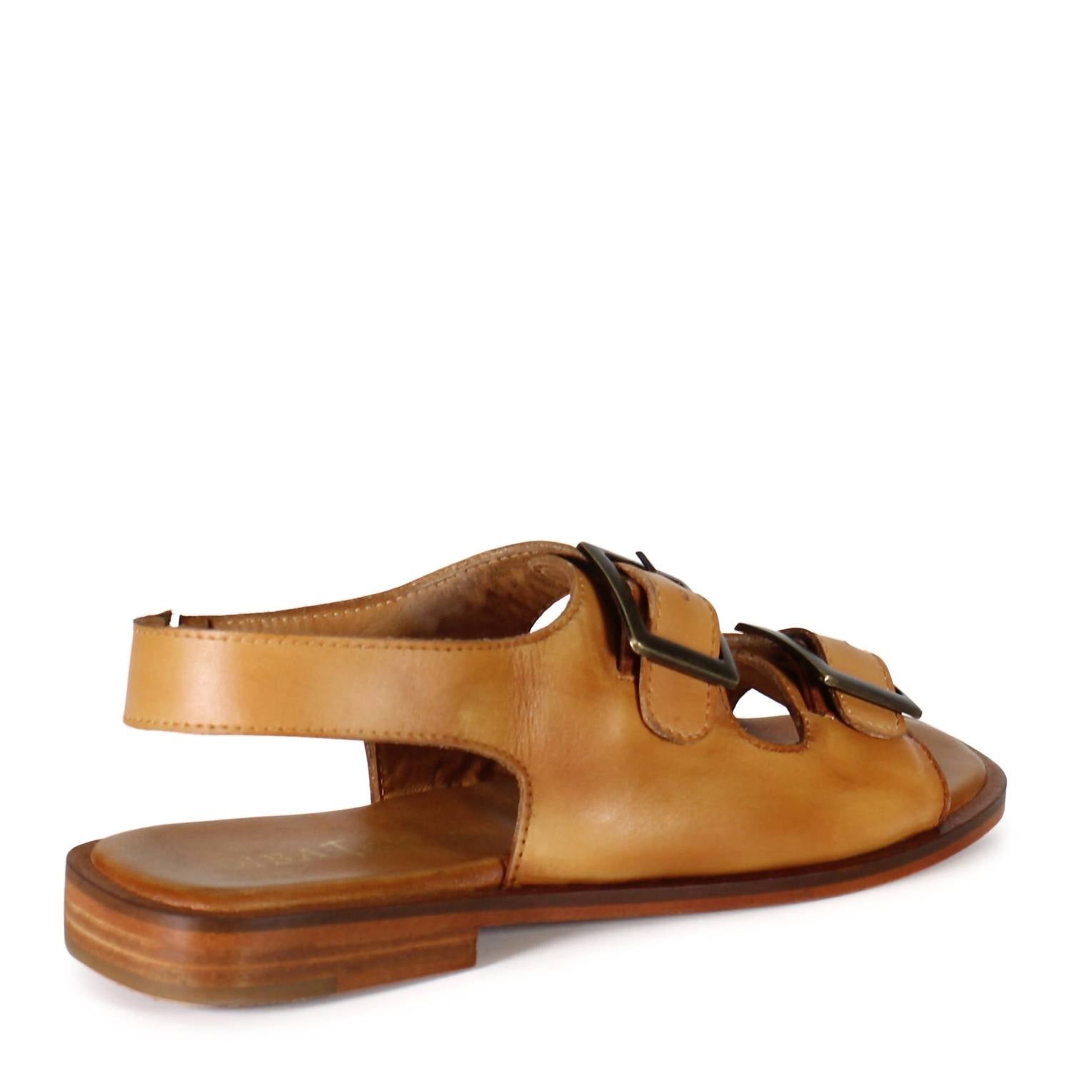This sandal will take you from brunch to dinner and everything in between. Step into timeless style with the Women's Law Less Sandal by DIBA True, crafted from genuine leather in a light brown hue. These women's sandals feature a modern square open toe and a 0.75" flat heel, perfect for comfortable all-day wear. The vintage-inspired design is enhanced by antique-finished double buckles and a slingback closure, making them a versatile staple for summer streetwear and travel.