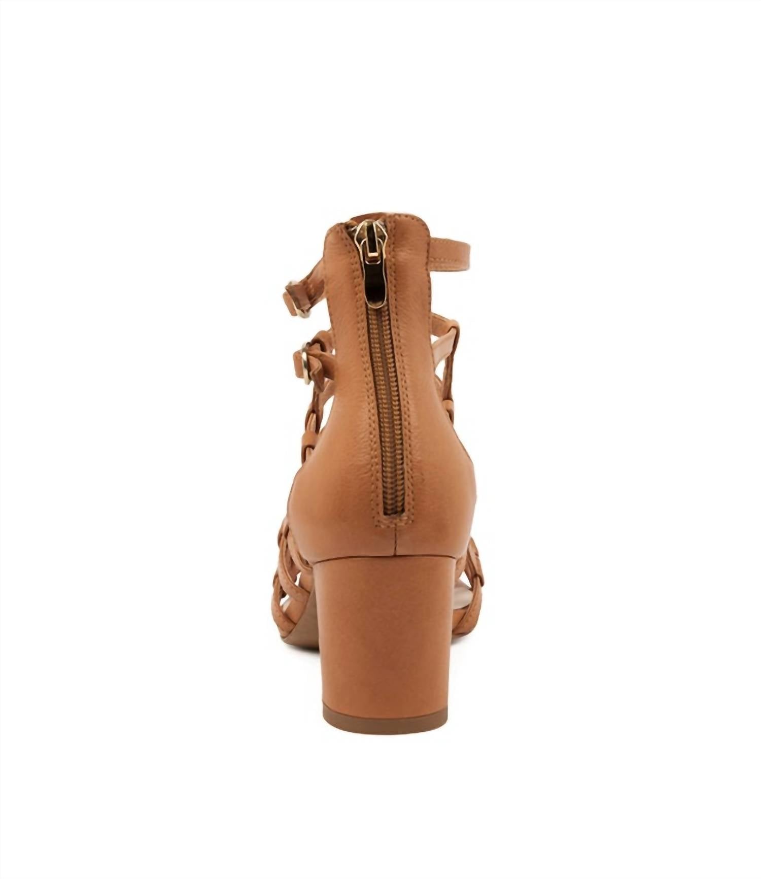 Flowy dresses, cropped pants, and even jumpsuits... this sandal works with them all! Step into elegance with the Women's Ebbie Sandals by Django and Juliette, a perfect fusion of design and comfort. These tan sandals boast a premium leather material with a stylish open-toe cage design, featuring interwoven straps and a strappy silhouette. The 2.4-inch stable block heel and rear zip fastening ensure easy wear and an all-day comfortable fit. Whether you're dressing up for the office or a night out, Ebbie offers a sophisticated touch to any wardrobe.