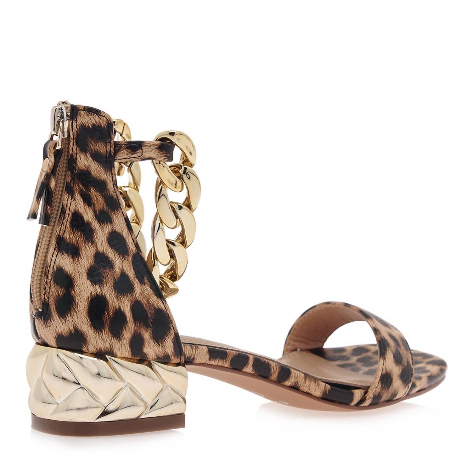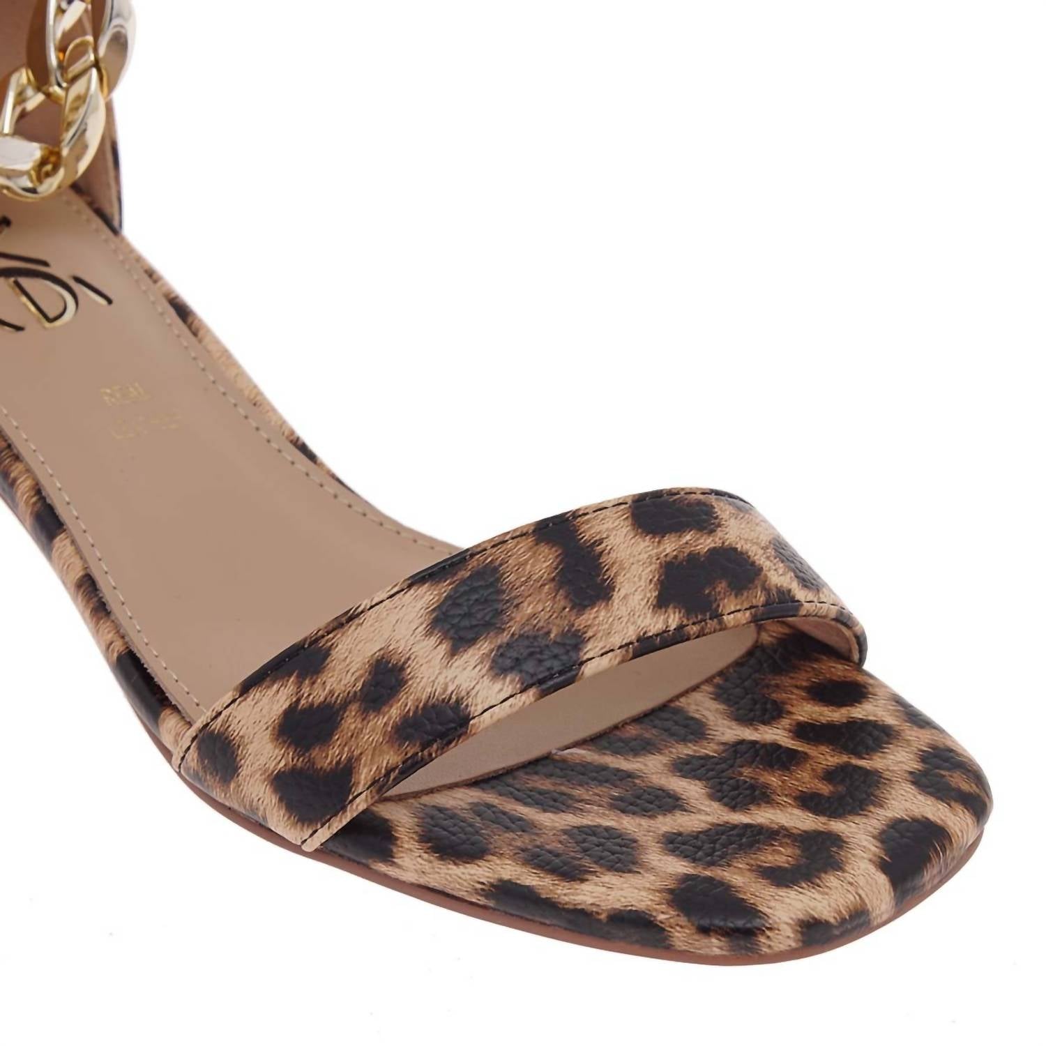 Classicly cute and all-day-wearable. We love this sandal. Introducing the Exe Women's Katy 386 Chain Sandal, a sophisticated footwear choice in a versatile animal print. This contemporary design features a squared toe and a distinctive chain detail, complemented by a low 1.1" heel. Originating from [Country not specified], these sandals are perfect for springtime dinner parties. Enjoy the comfort of an all-day wearable sole, merging style with functionality seamlessly.