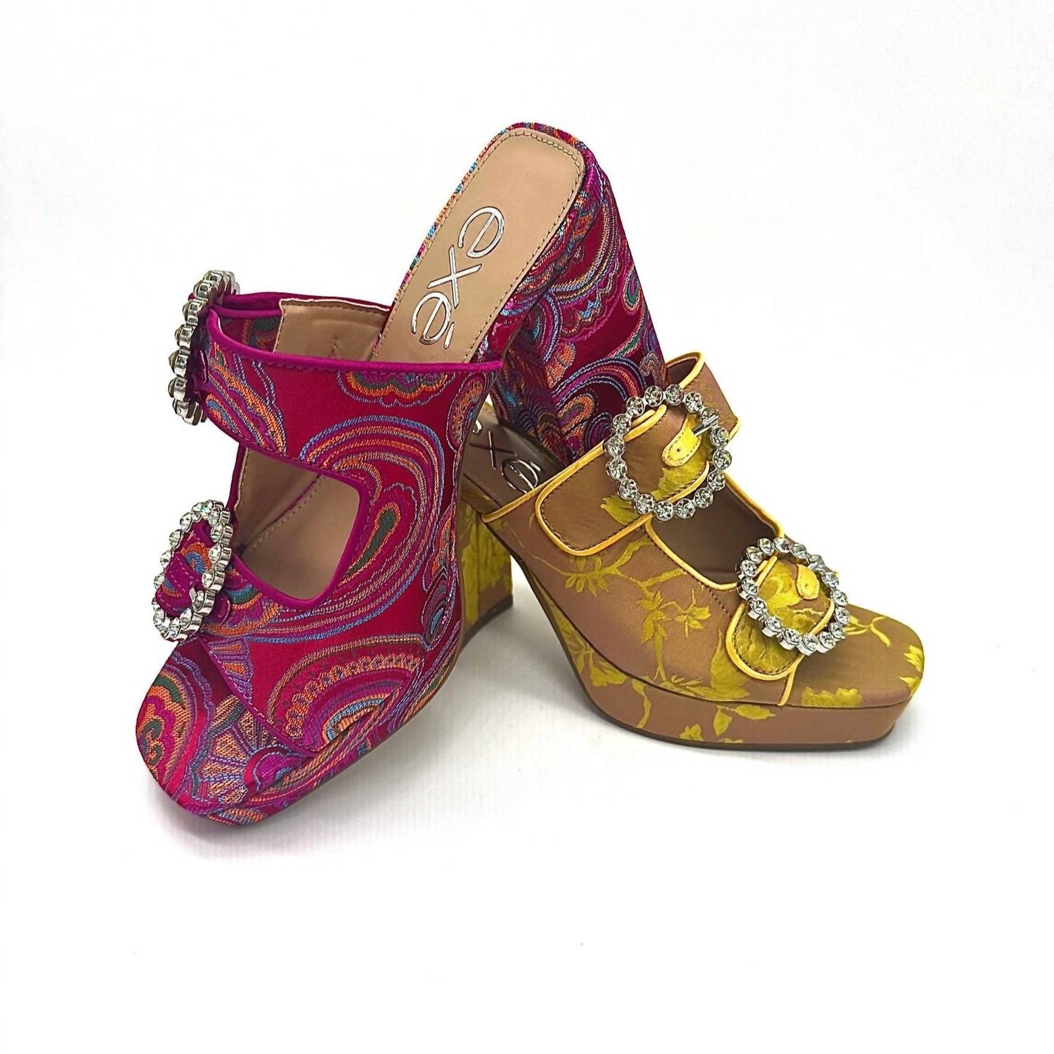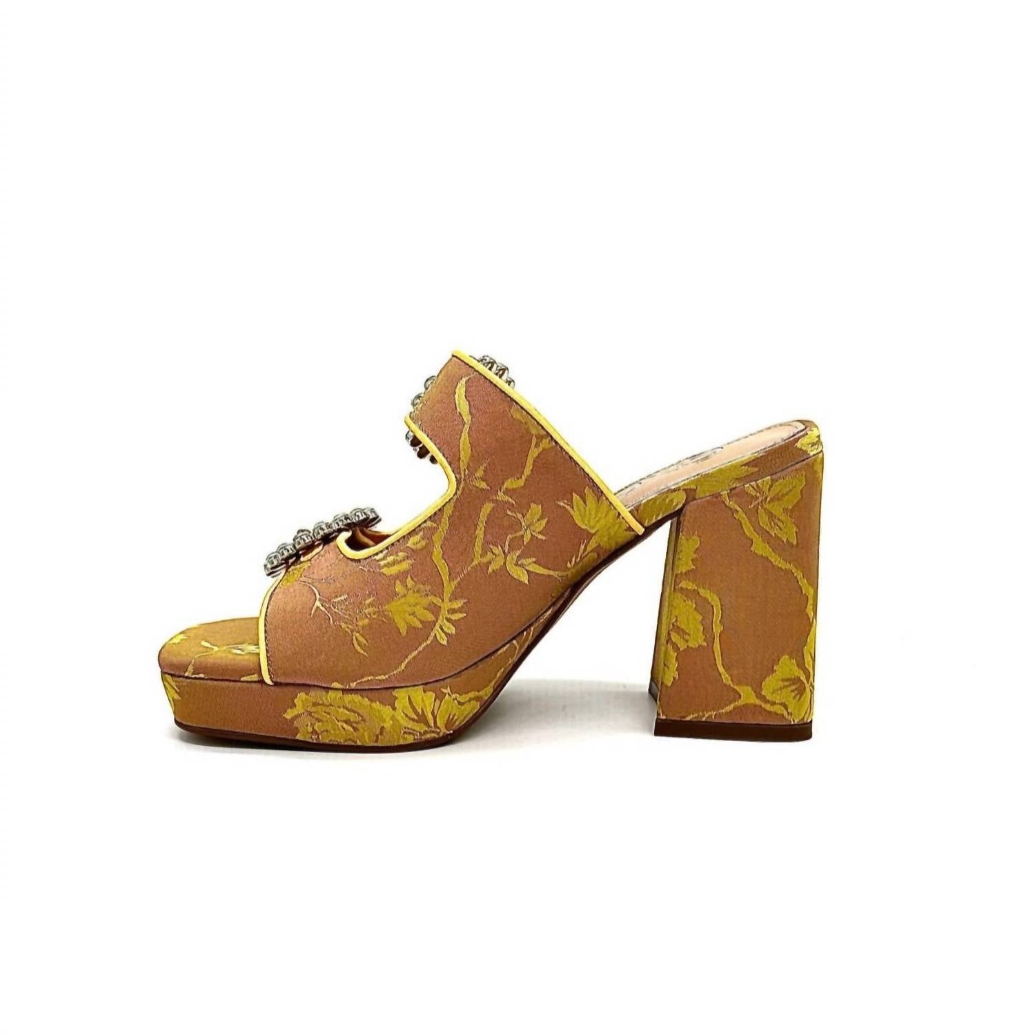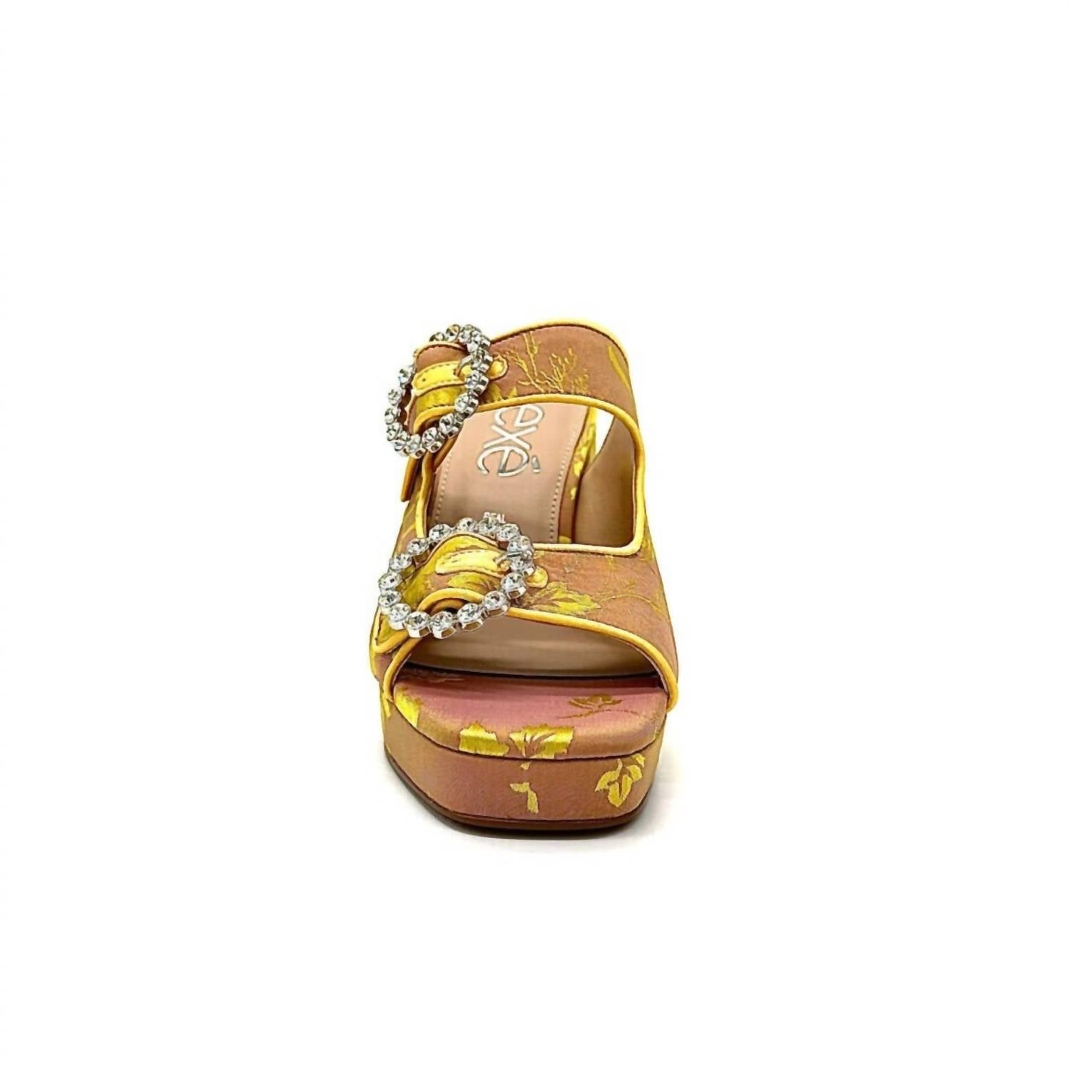 Classicly cute and all-day-wearable. We love this sandal. Introducing the Women's Luna Block Heel Sandal by Exe, a perfect addition for your dinner parties with a touch of Quiet Luxury. Featuring a chic open toe design, these sandals combine a high heel height of 3 1/4" and up, ensuring both elegance and comfort. The slip-on design boasts a leather insole and a vibrant fabric outer, offering a delightful pop of yellow and champagne hues to spice up any outfit. Proudly imported, these sandals are a must-have for the fashion-forward woman.