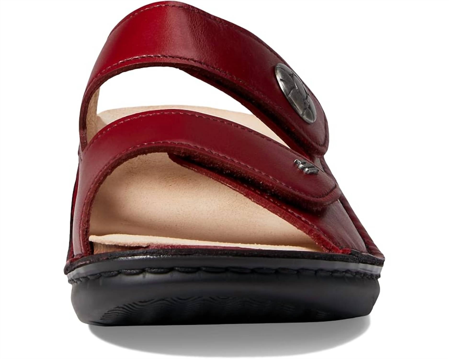 This sandal will take you from brunch to dinner and everything in between. Step into summer style with the Women's Moorea-s Sandals by Finn Comfort, a must-have for vacation-ready looks. Crafted with luxurious red Sierra leather, these sandals embrace a streetwear trend that's perfect for any summer occasion. Designed with a flat heel and an open toe, they offer comfort and fashion in equal measure. Ideal for adults looking for a stylish yet comfortable footwear choice.