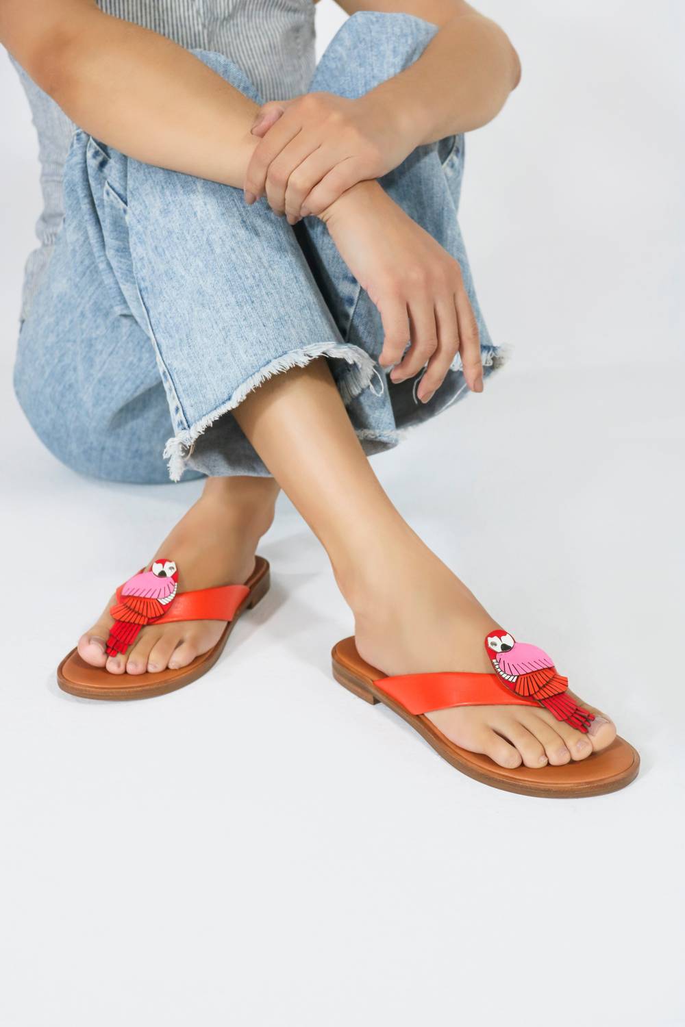 Flowy dresses, cropped pants, and even jumpsuits... this sandal works with them all! Step up your summer style with the Women's Patty Parrot Sandal by HOUSE OF ZALO, showcasing an open toe design with a playful, colorful parrot ornament in shades of pink, orange, and red. Crafted entirely from leather, this sandal features a napa leather lining and sock for added comfort, and a 1-inch stacked flat leather heel. The leather welted construction is complemented by a durable rubber outsole, ensuring a steady stride on vacation or any sunny day out. Embrace maximalist trends with this statement piece that's perfect for medium width.
