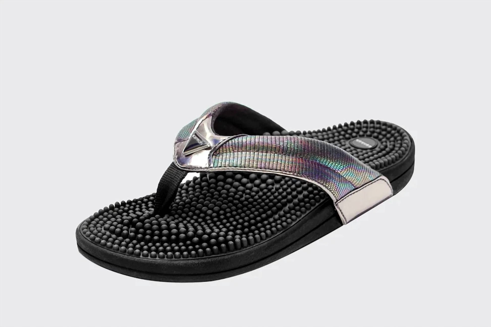 Classicly cute and all-day-wearable. We love this sandal. Elevate your summer wardrobe with the Kenkoh Women's Spirit V Massage Sandal in Silver Metallic, perfect for vacations or minimalist styling. Designed with soft padded uppers and a fabric thong piece, these sandals ensure maximum comfort. Over 1,000 rubber nodules on the fully contoured footbed provide a soothing massage to your feet while supporting all three arches. With a durable rubber outsole and an open toe design, they boast a flat heel less than 1" high, making them ideal for stress relief and improving circulation during your adventures.